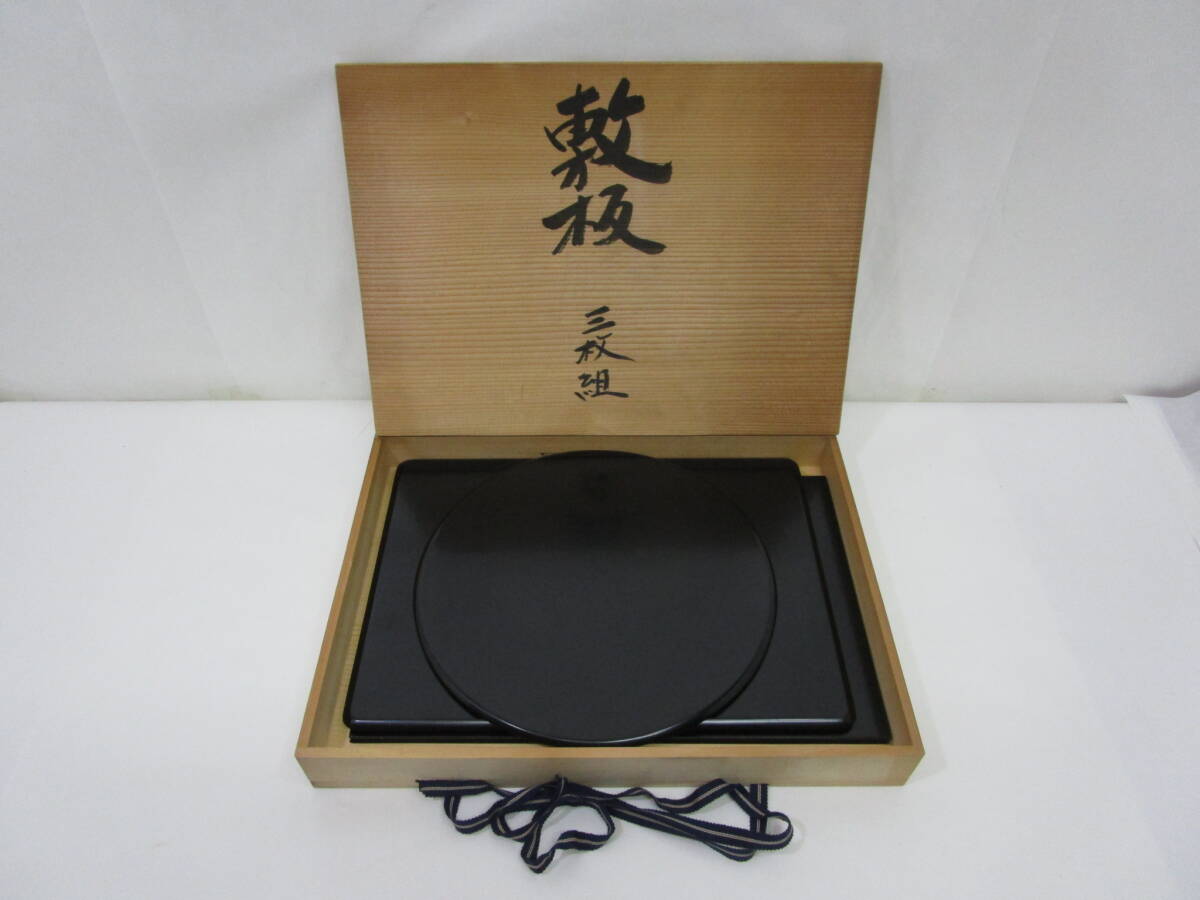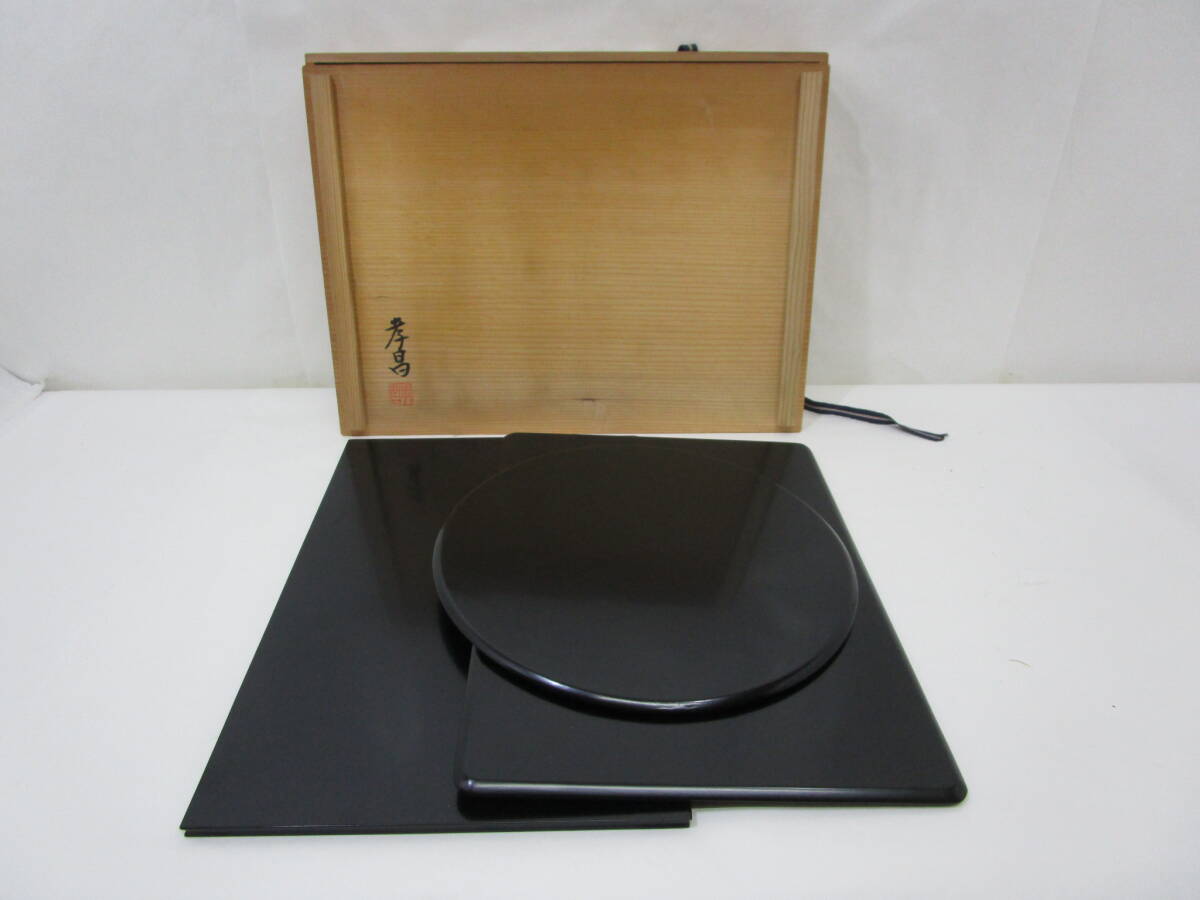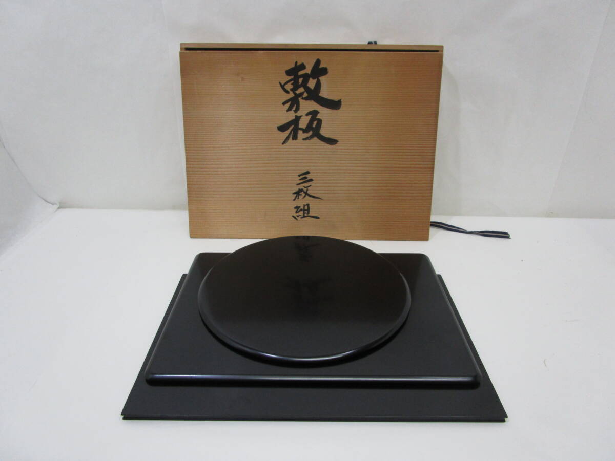 中古茶道具! 塗師 孝昌作 真塗 三枚組 敷板 (薄板)です。分厚くてやや古い使用品です。擦れ傷は有りますが!気にならない程度です。共箱のサイズ:46㎝×34㎝×高6㎝ 重量感有り。即決処分です。 どうぞ宜しく。