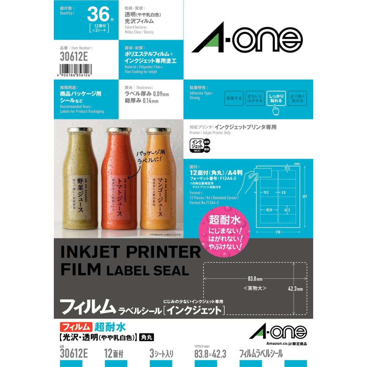 エーワン ラベルシール インクジェット 超耐水 光沢フィルム 透明 12面 3シート 30612E