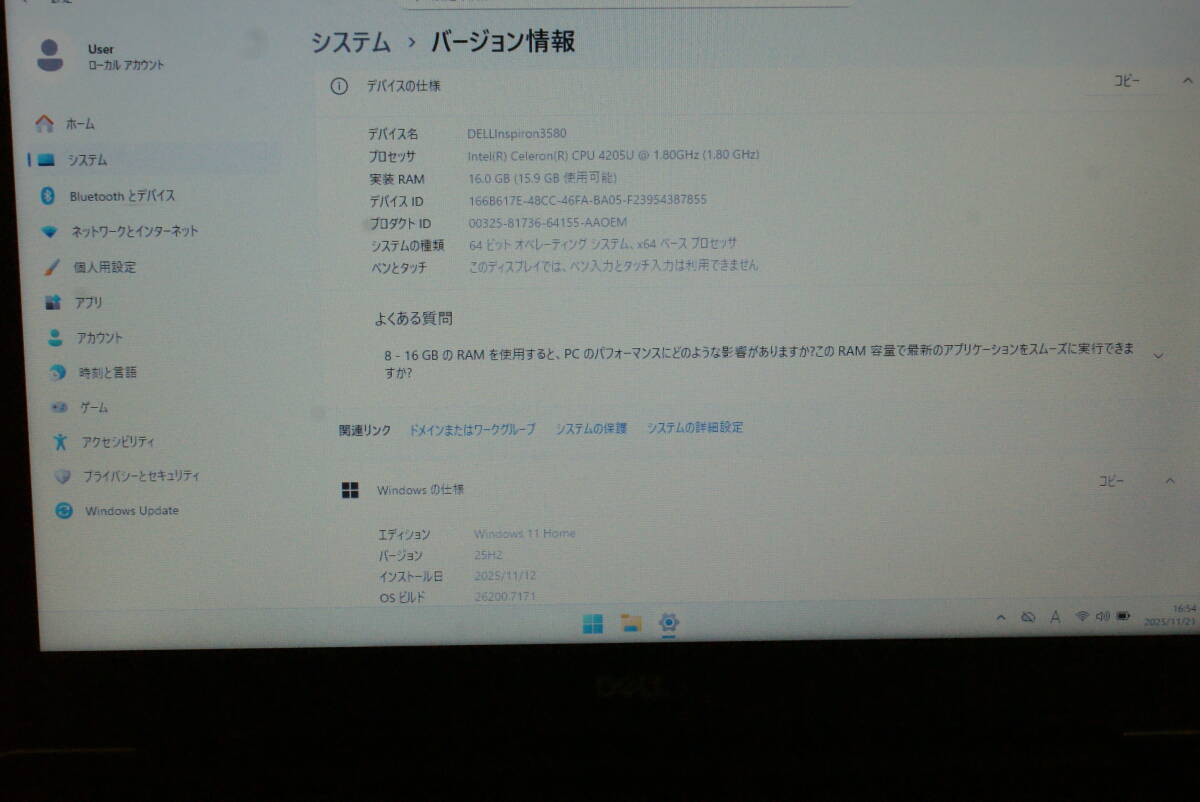 中古品を入手した物です。付属のバッテリーをノートPC本体に装着し、付属のACアダプター及びACケーブルを接続して、充電が出来て電源が入り、インストールされていた Windows 11 Pro をOSとした動作、及び、インストールされていた Microsoft Office Professional Plus 2021 起動の確認が出来ましたので、出品致します。