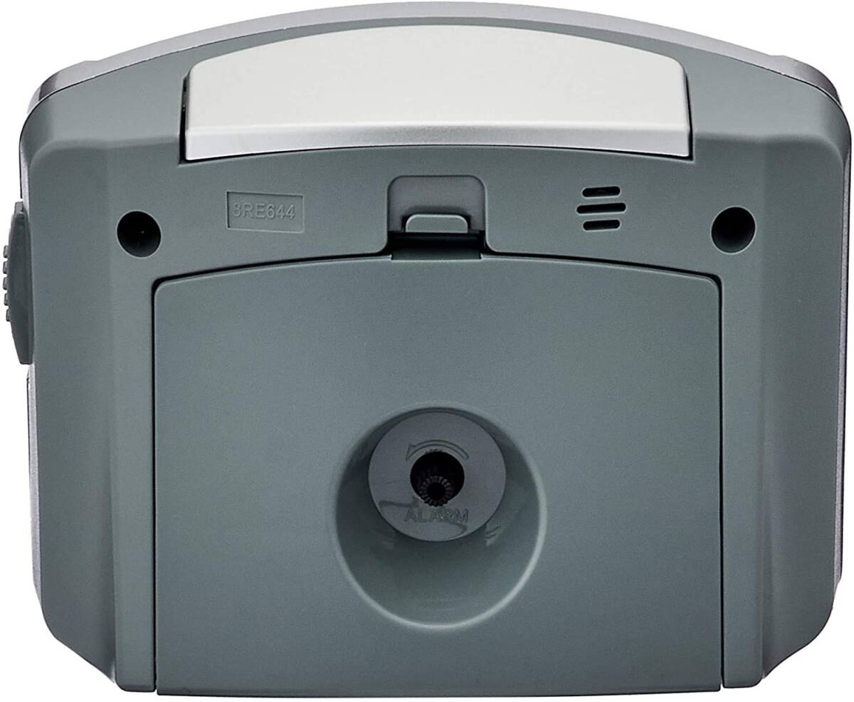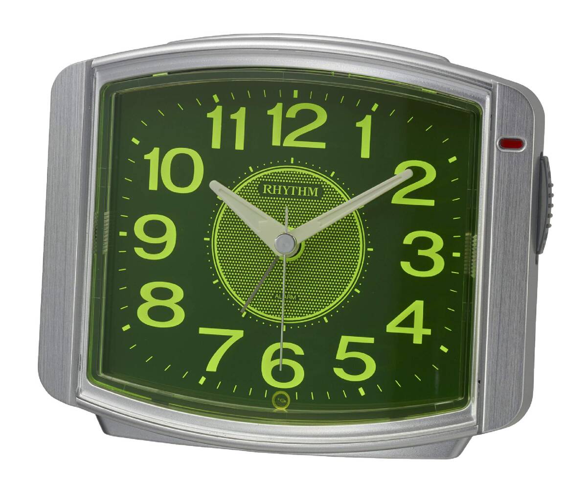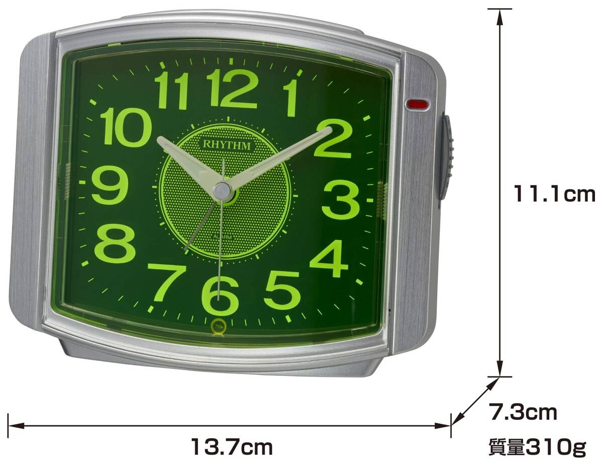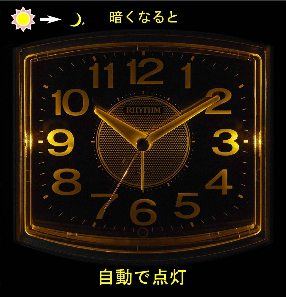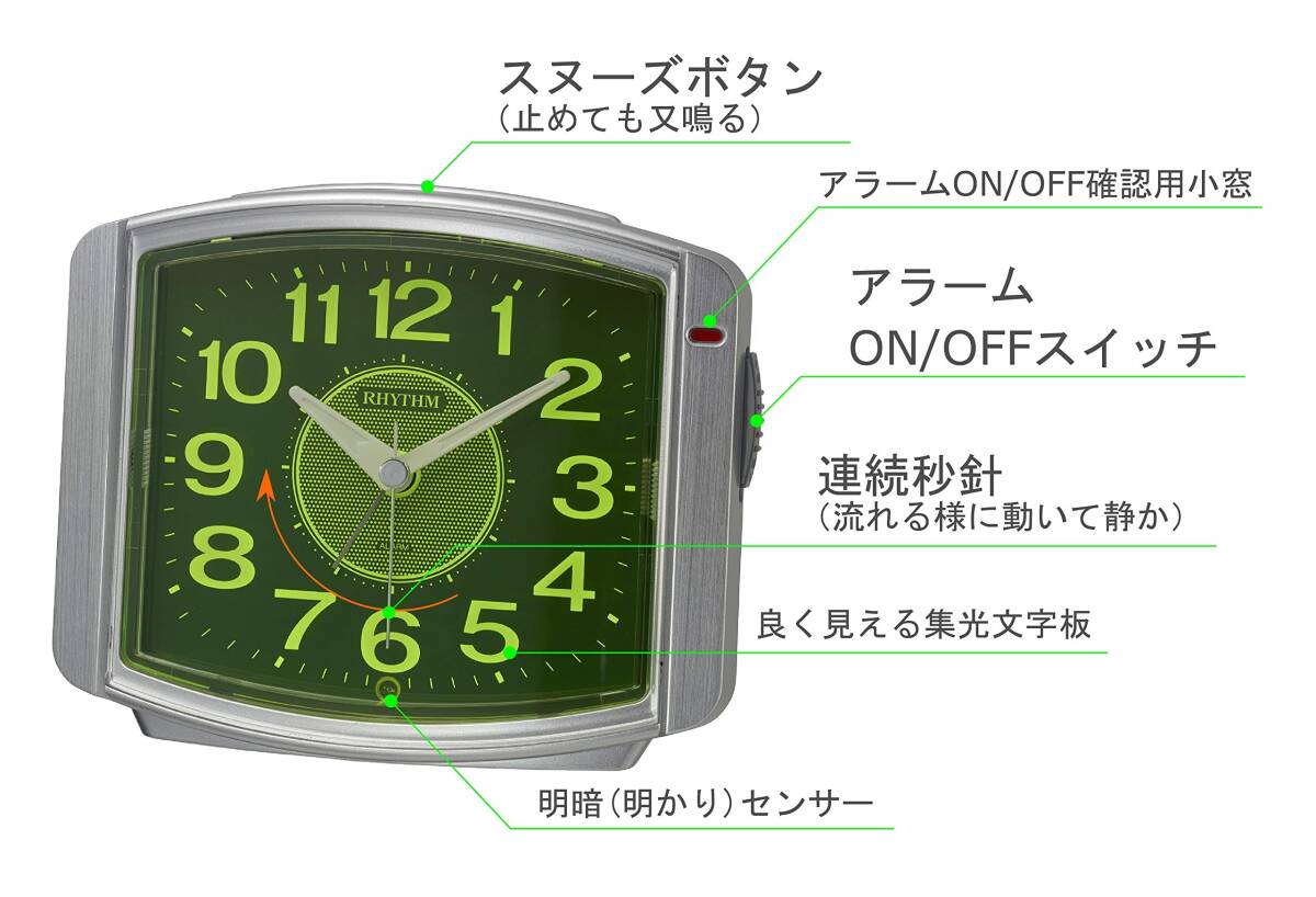 4段階電子音アラーム(ピピピピ 小<大) 止めても数分後に再び鳴るスヌーズ機能付き アラームON/OFF確認用小窓付き 流れるように秒針が静かに動く連続秒針 暗所自動点灯ライト付き(明暗センサー) 見やすい文字板