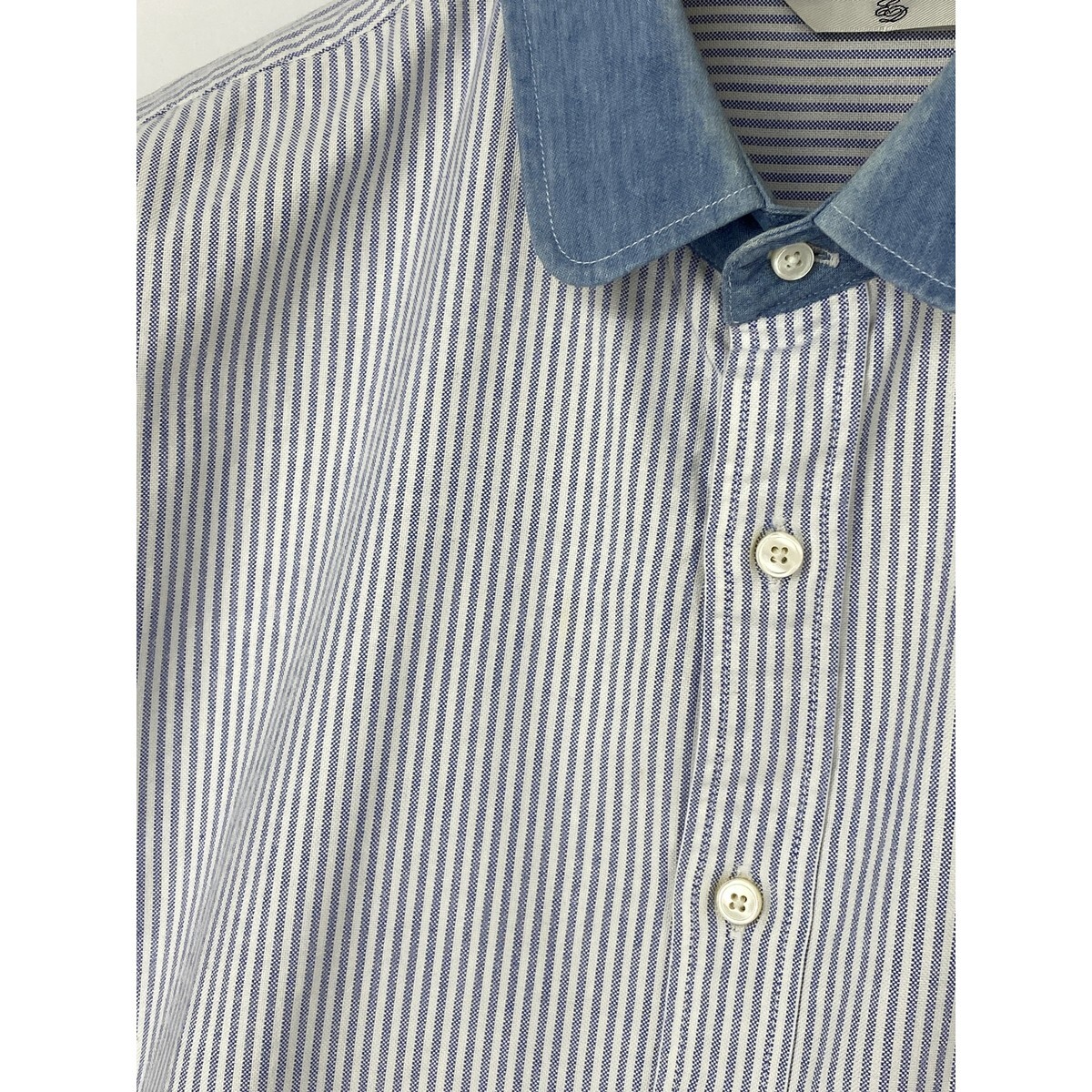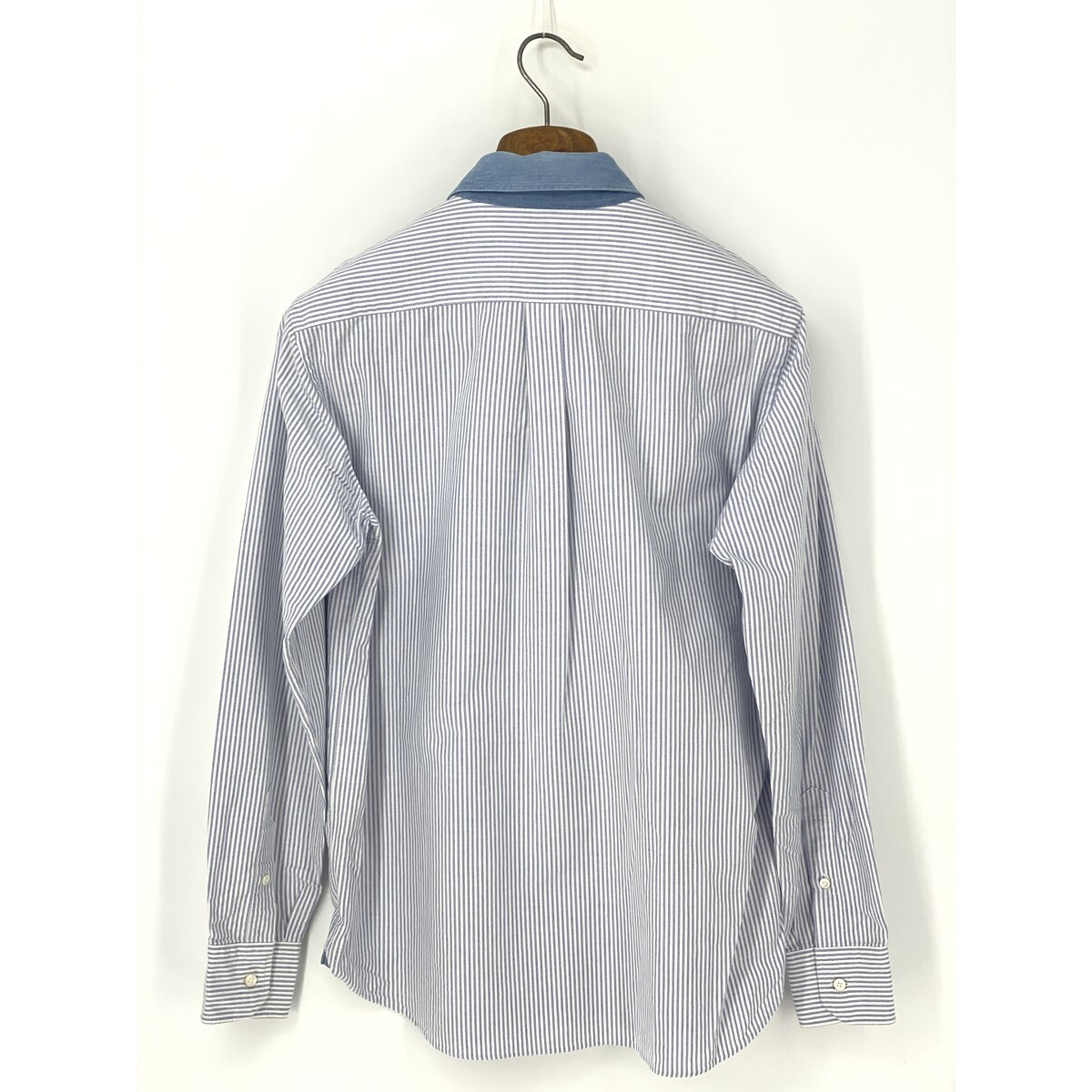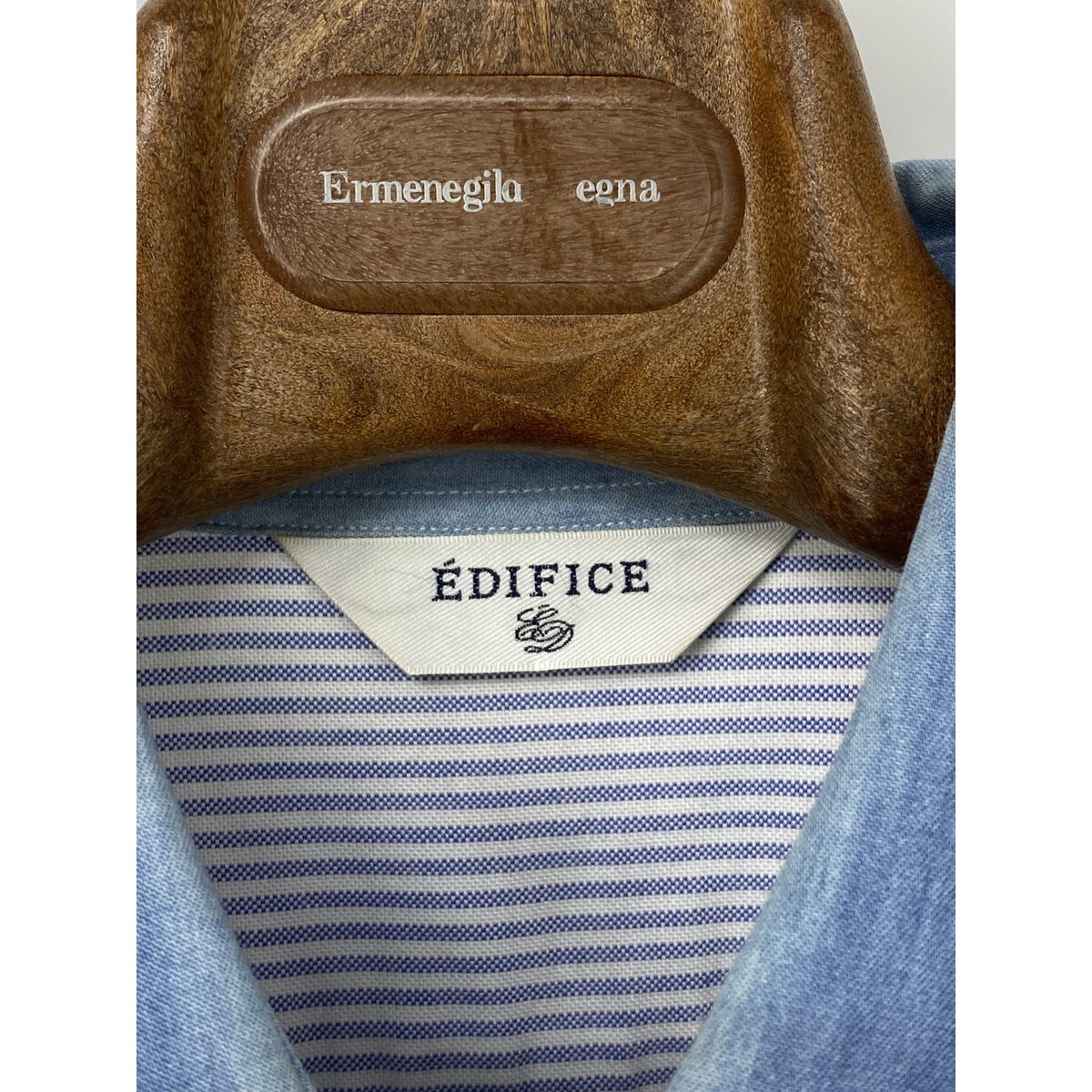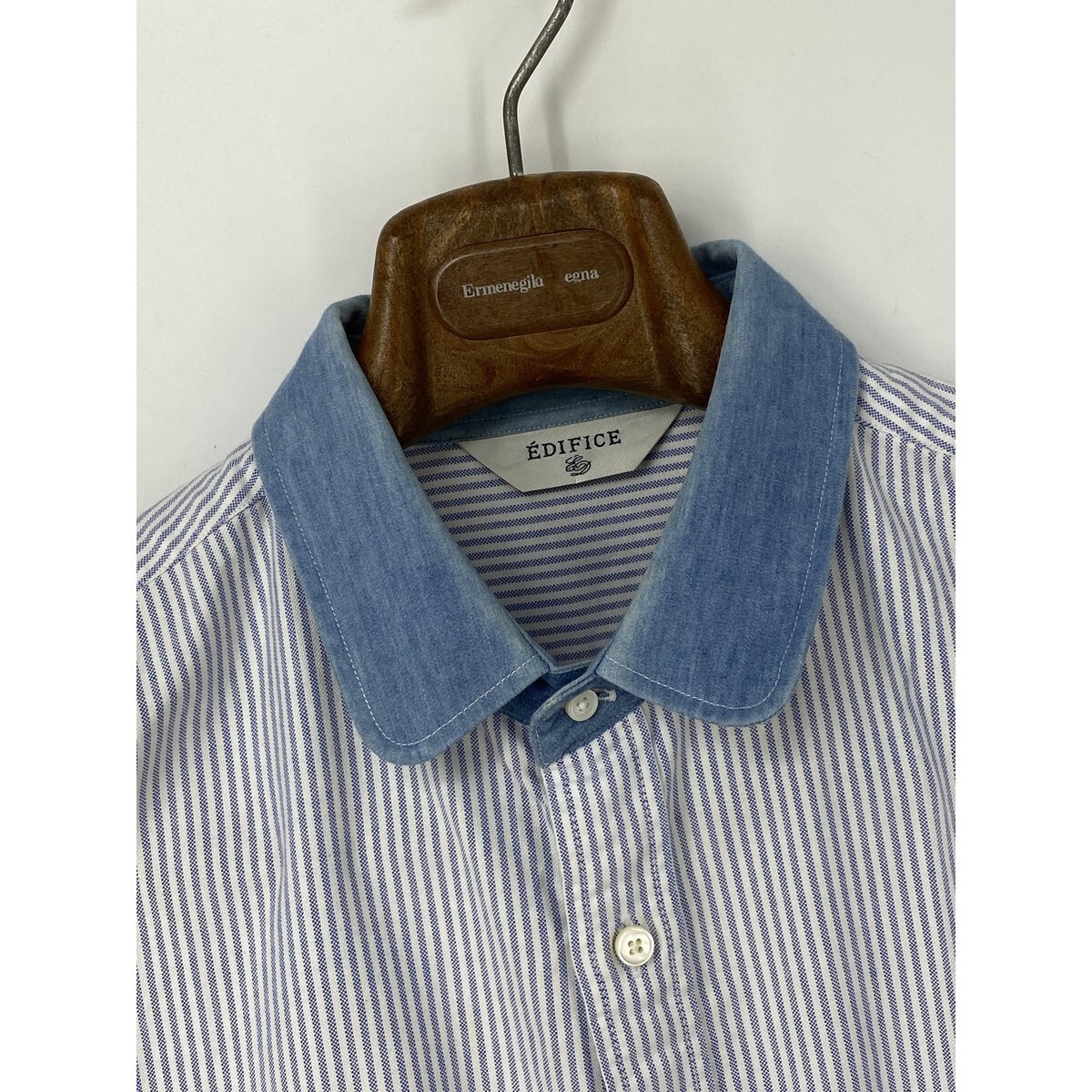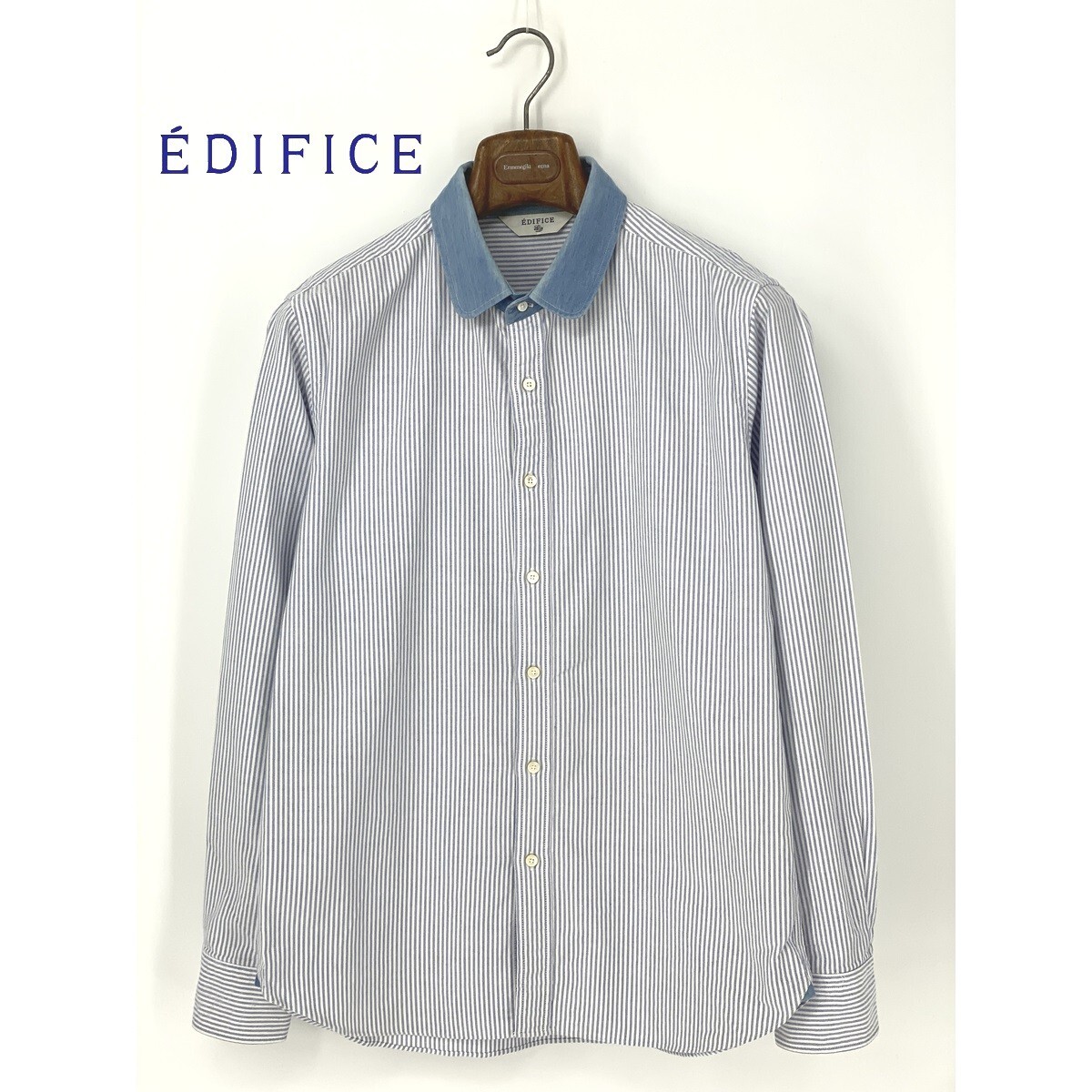 A8834/美品 春夏 EDIFICE エディフィス コットン 長袖 ストライプ ラウンドカラー ドレス カジュアル シャツ 48 L程 青 日本製 メンズ