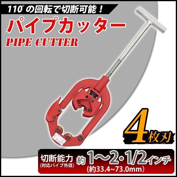 | 商品名 | 送料無料 パイプカッター 4枚刃 対応パイプ外径 約1~2・1/2インチ 1B~2・1/2B 約33.4~73.0mm 25A~65A パイプカッタ 単管カッター 切断機 手動 パイプ用 カッター パイプ 管 切断 単管 埋設管 鋼管 SG管 被覆鋼管 スチール管 ステンレス管 作業工具 配管 pipecutter2s |