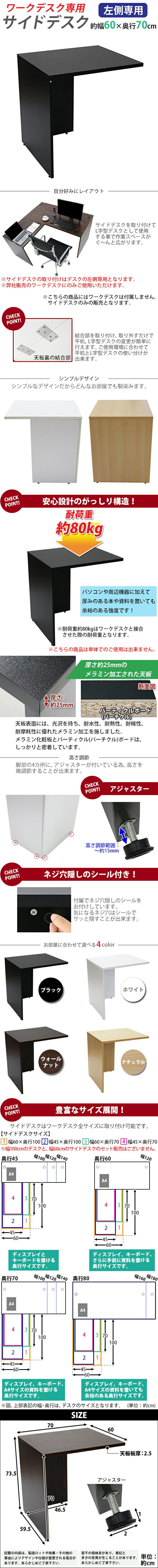 | 商品紹介 | ■弊社販売のワークデスクにのみご使用いただけます。 (こちらの商品は、弊社販売のワークデスクworkdesk,desk07,desk11にのみ使用可能です。) ■作業スペースを広く確保出来る、ワークデスク専用のサイドデスクです。 ■幅が約60cmのタイプです。 ■付属のプレートでワークデスクとサイドデスクを固定するだけの簡単接合。 ■会議室や事務所等、オフィス家具として様々なシーンでお使いいただけます。 ■天板には、メラミン加工を施しています。 ■天板裏の結合金具、ネジ穴隠しのシール付き。 ■アジャスターで高さの調節が可能です。(高さ調節範囲〜約15mm) ※こちらの商品は、組立て式です。組立てにはプラスドライバーが必要です。お客様でご用意ください。 ※組立図が付属します。 ※サイドデスクの取り付けはデスクの左側専用となります。 ■材質:パーティクル(パーチクル)ボード(メラミン加工)(本体)、プラスチック(アジャスター) ■重量:約16kg ■耐荷重:約80kg(ワークデスク接合時) ●新品商品ではありますが、輸入商品の為、多少の擦り傷などがある場合がございますので、ご納得の上ご購入下さいませ。 ●ご購入後、お客様ご都合によるご返品、ご返金等は一切お受け致しておりません。 ●本商品を使用した際に発生したトラブル、事故につきまして、当社は一切の責任を負いません。ご使用に関しましては、全て自己責任にてお願い致します。 ※カラーはブラックとなります。 |