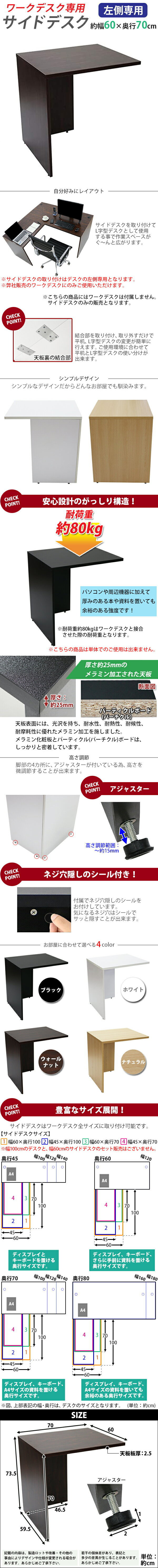 | 商品紹介 | ■弊社販売のワークデスクにのみご使用いただけます。 (こちらの商品は、弊社販売のワークデスクworkdesk,desk07,desk11にのみ使用可能です。) ■作業スペースを広く確保出来る、ワークデスク専用のサイドデスクです。 ■幅が約60cmのタイプです。 ■付属のプレートでワークデスクとサイドデスクを固定するだけの簡単接合。 ■会議室や事務所等、オフィス家具として様々なシーンでお使いいただけます。 ■天板には、メラミン加工を施しています。 ■天板裏の結合金具、ネジ穴隠しのシール付き。 ■アジャスターで高さの調節が可能です。(高さ調節範囲〜約15mm) ※こちらの商品は、組立て式です。組立てにはプラスドライバーが必要です。お客様でご用意ください。 ※組立図が付属します。 ※サイドデスクの取り付けはデスクの左側専用となります。 ■材質:パーティクル(パーチクル)ボード(メラミン加工)(本体)、プラスチック(アジャスター) ■重量:約16kg ■耐荷重:約80kg(ワークデスク接合時) ●新品商品ではありますが、輸入商品の為、多少の擦り傷などがある場合がございますので、ご納得の上ご購入下さいませ。 ●ご購入後、お客様ご都合によるご返品、ご返金等は一切お受け致しておりません。 ●本商品を使用した際に発生したトラブル、事故につきまして、当社は一切の責任を負いません。ご使用に関しましては、全て自己責任にてお願い致します。 ※カラーはウォールナットとなります。 |