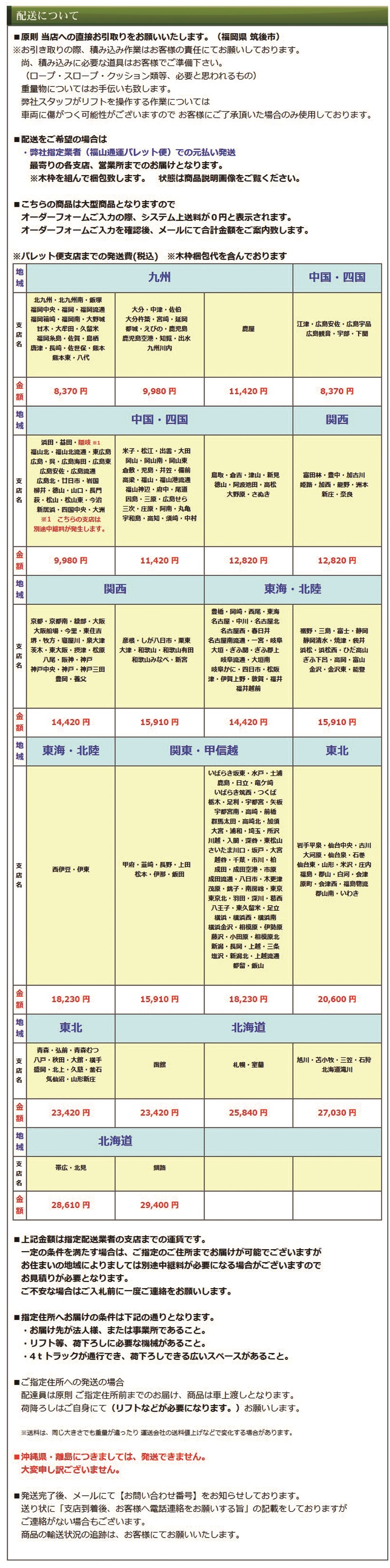 送料が0円と表記されている商品は原則直接引取りをお願いしております 商品の発送をご希望されるお客様につきましては システム上0円と表記されますが、 お届けには送料が発生致します。 配送方法は■福山通運 ■JPロジスティクス(旧TOLLエクスプレス) のいずれかのパレット便となります。 お届けは、ご自宅ではなく最寄りの支店留めとなります。 詳細は、「配送について」の欄へ記載しておりますので、必ずご確認頂き ご検討下さいますようお願い致します。 |