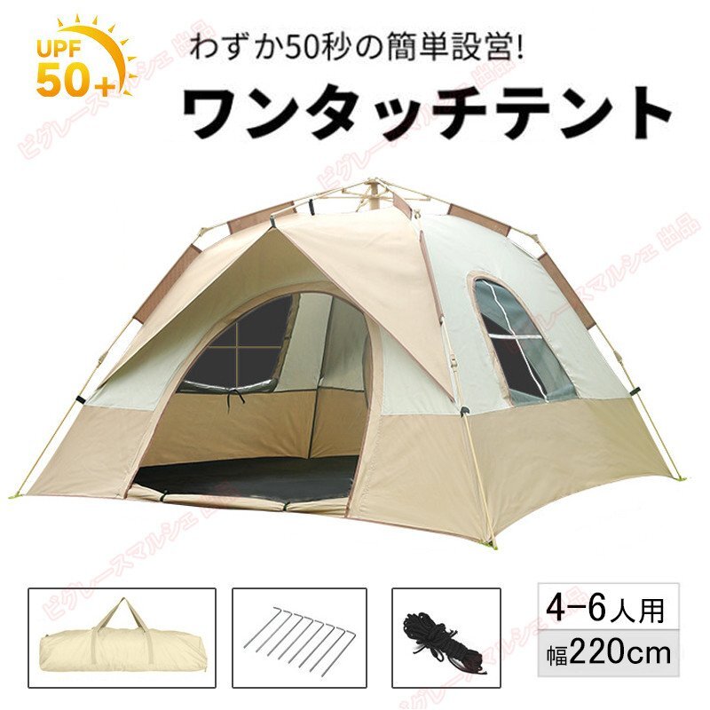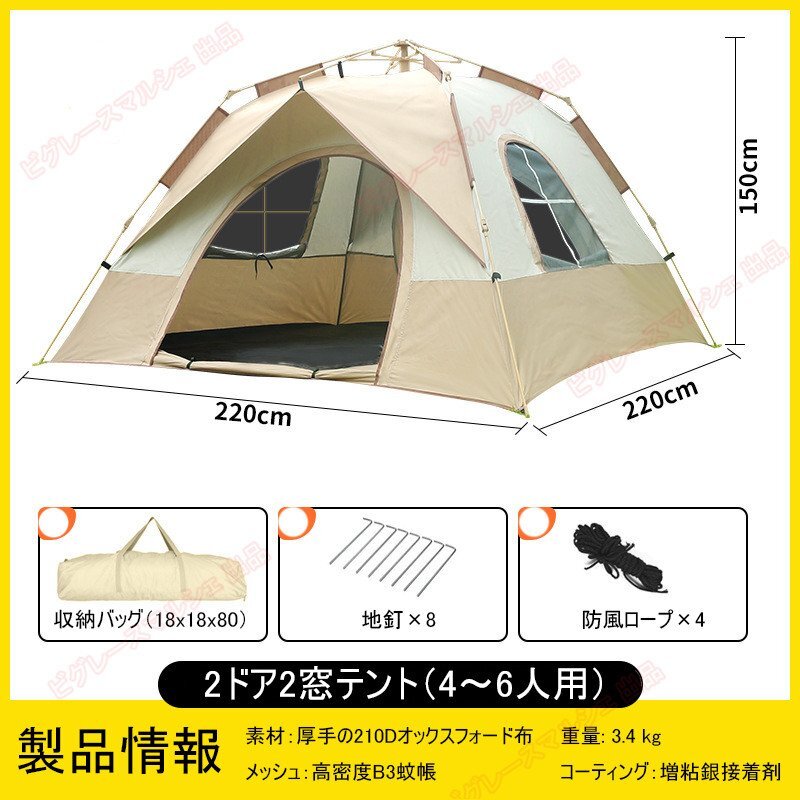 テント ワンタッチ キャンプテント 4-6人用 耐水圧2000+mm 防水撥水 設営簡単 軽量 防虫対策 ゆったり空間 日陰濃い 通気 前後ダブルドア 220*220*150cm 耐火難燃 公園 登山