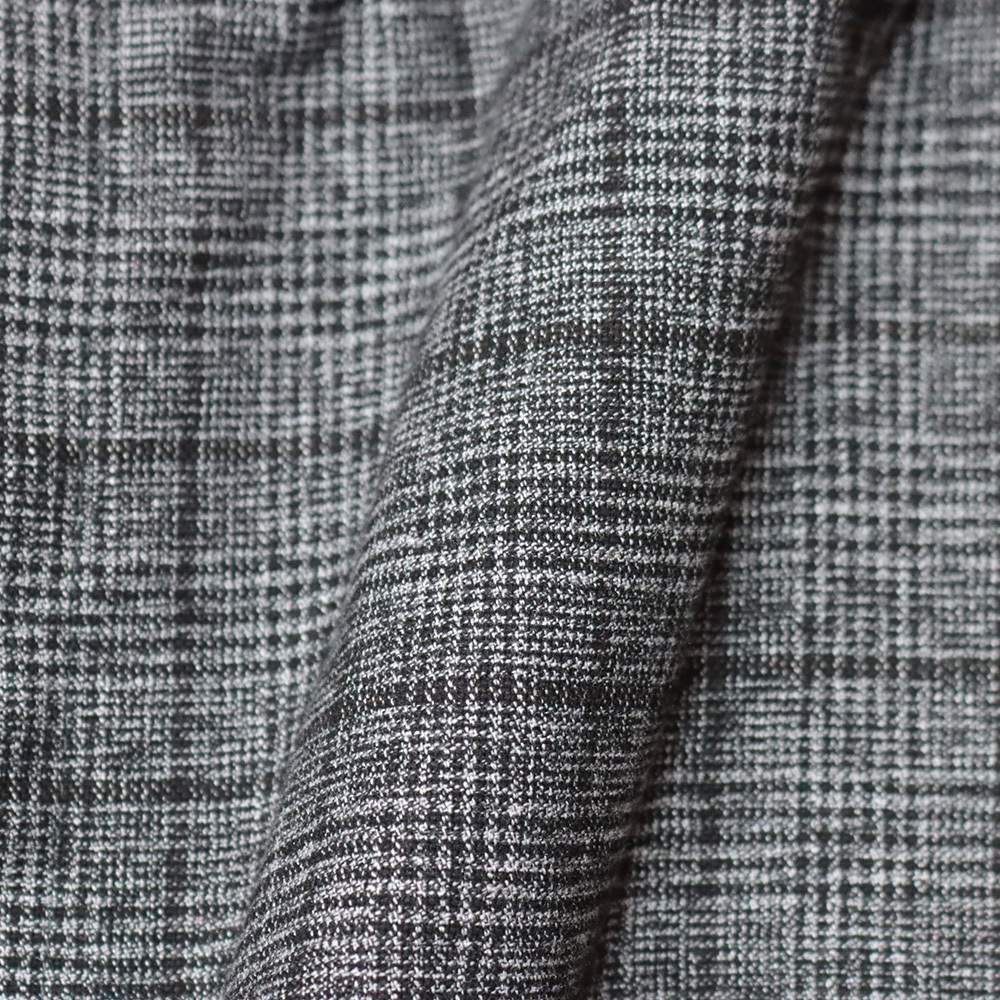 素材は、梳毛ウールのような上品な表情を持つ、ポリエステルレーヨンの先染めチェック。伝統的なグレンチェックを少し崩した「トーンオントーン・チェック」で、ベースカラーに馴染んだ控えめで上品な柄が特徴です。また、染色には水をほとんど使用しない「熱で着色する技術」を採用。環境に配慮したサステナブルな方法で作られた素材を使用しています。
