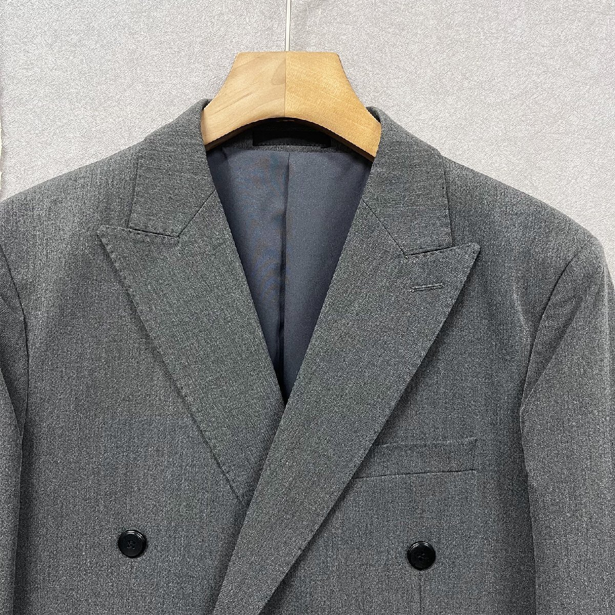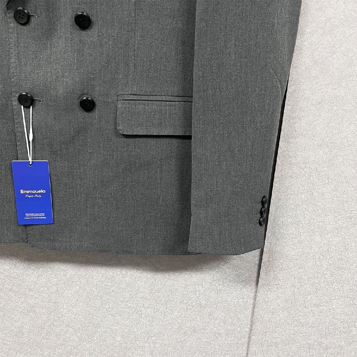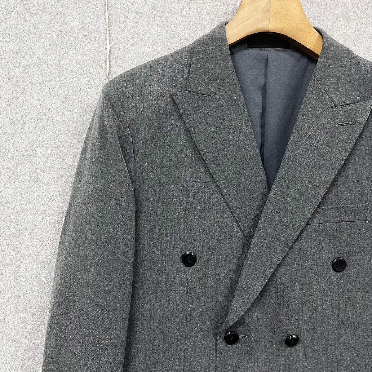 前はダブルボタンデザインなので、男の色気を引き出す、ゆったりシルエットが作るスーツです。肩、首回りがフィットし程よくふんわりとしたラペル(襟)部分が立体感を演出します。袖口には三つボタンを採用して、シンプルでありながら洗練された印象を与える。