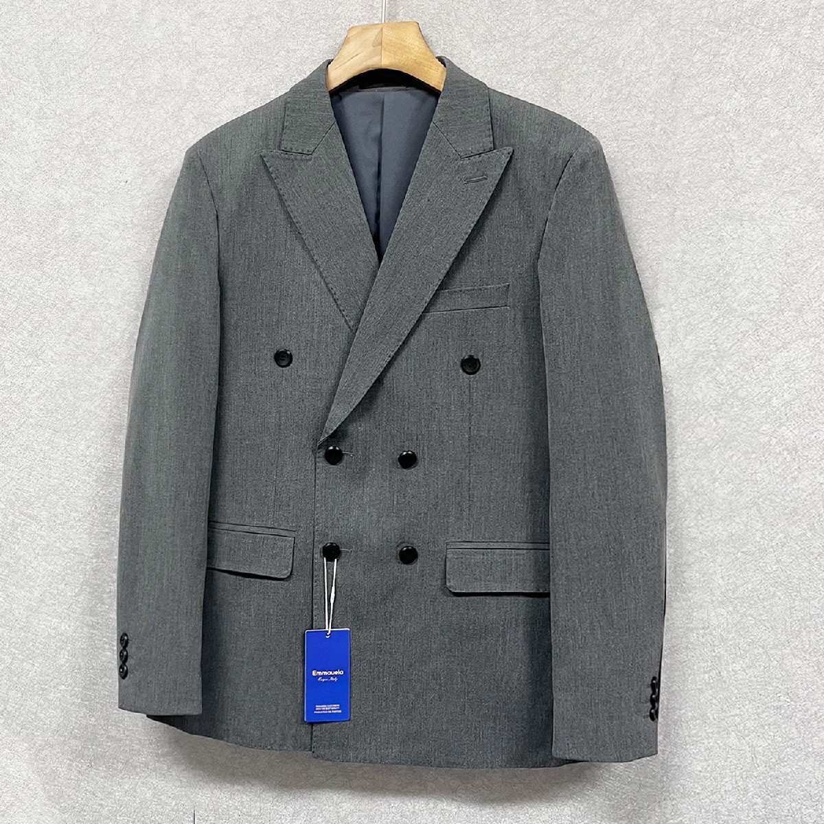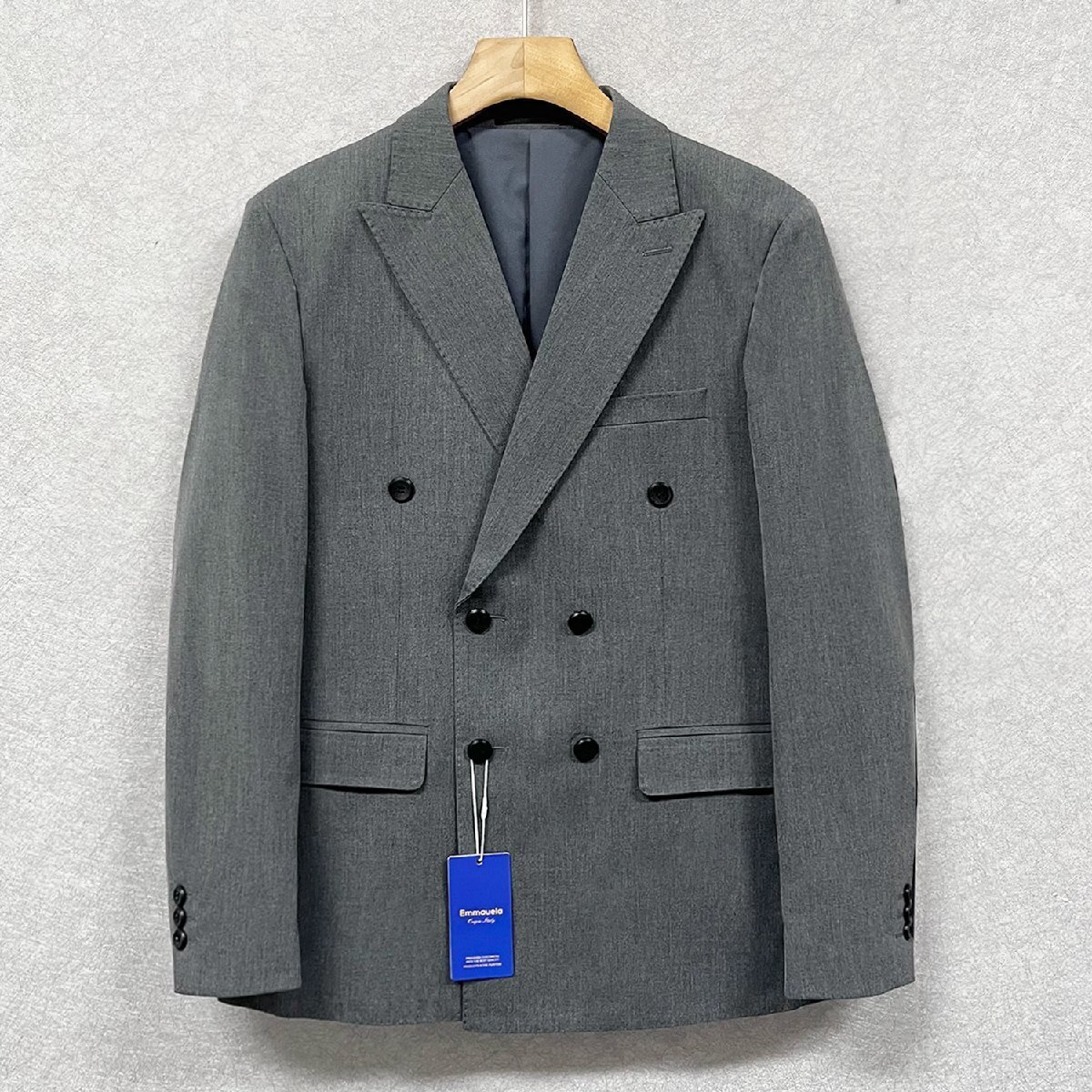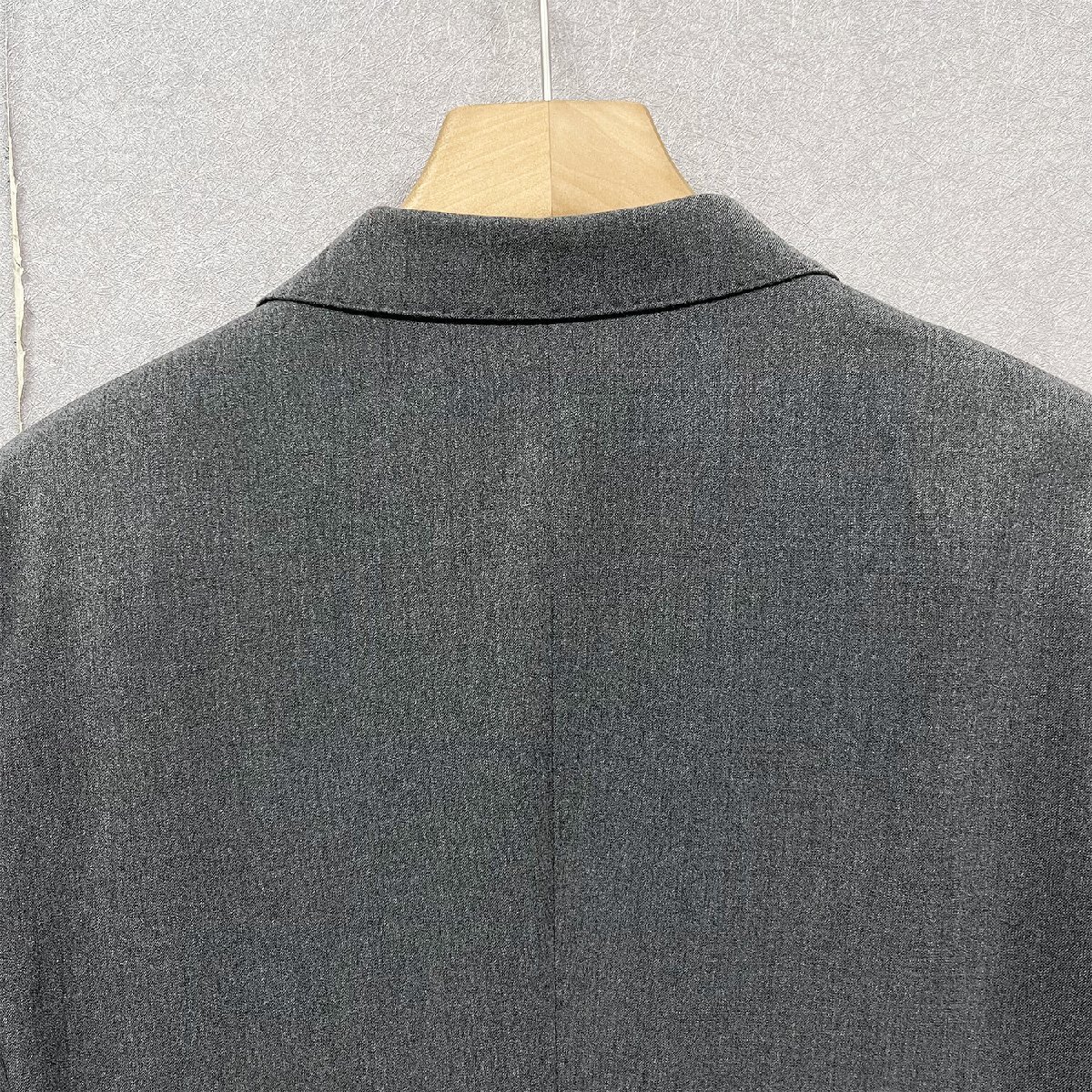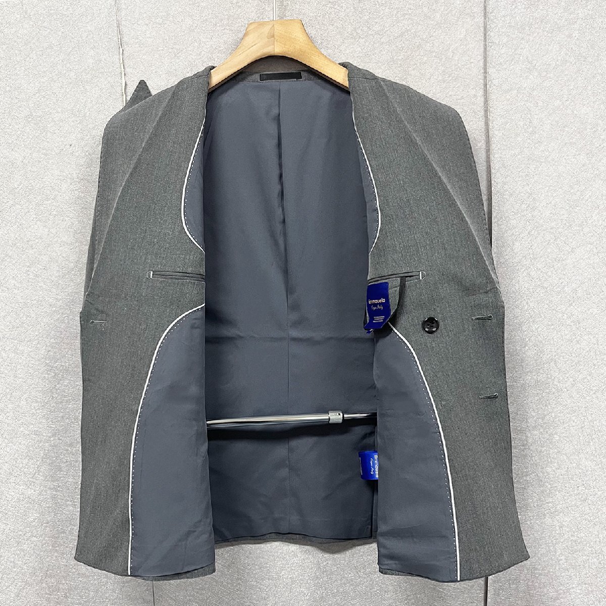 前はダブルボタンデザインなので、男の色気を引き出す、ゆったりシルエットが作るスーツです。肩、首回りがフィットし程よくふんわりとしたラペル(襟)部分が立体感を演出します。袖口には三つボタンを採用して、シンプルでありながら洗練された印象を与える。