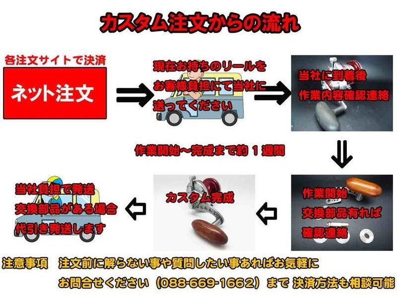 こちらにリールが届き、作業開始~作業完了まで1週間程度ですが、部品の交換や込み具合によりお時間をいただく場合があります