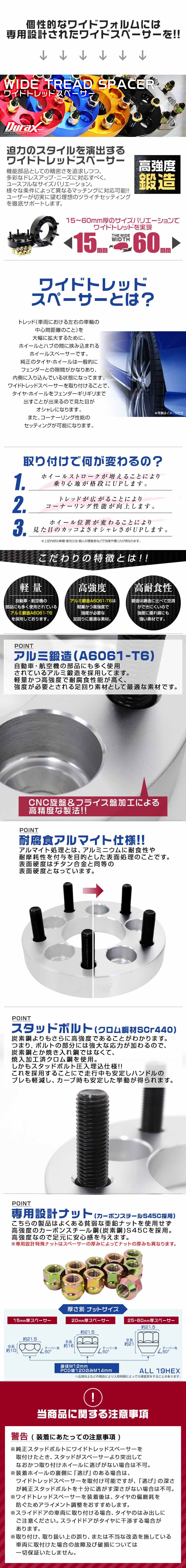●腐食対策として陽極酸化処理(アルマイト)を行っておりますので長期間使用により錆を軽減 長期間の使用においても、高い品質を維持します。 ●CNC旋盤、フライス盤加工による高精度な作りです。 ●専用ナットも付属してます。 (仕様) ○安心のセット内容:鍛造ワイドトレッドスペーサー黒4枚1セット+専用ナット ○ハブ径:約57mm ○外径:約140mm ○色 :黒 ○厚み :20mm ○PCD:100mm ○穴数 :4穴 ○ネジピッチ : M12×P1.5 ○素材:鍛造アルミ合金 A6061-T6 ○スタッドボルト:クロム鋼 SCr440 ○貫通ナット:19HEX カーボンスチール S45C ○プロセス:CNC旋盤、フライス盤加工 ○表面処理:ブラックアルマイト処理 ○新品未使用 |