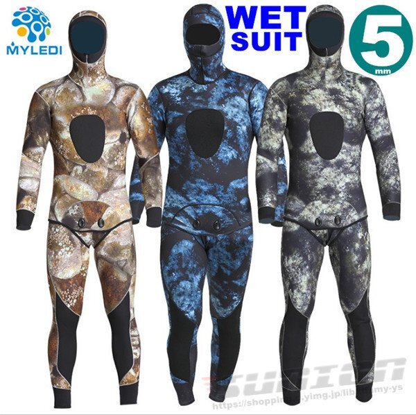 【商品説明】【ブランド】MYLEDI【サイズ】S,M,L,XL,XXL,3XL【厚 さ】 5mm○2ピースウェットスーツ○フード付きジャケット○ハイウェストパンツ○ダブルボタン形状○表面素材:超弾力性ネオプレン 通気性に大変優れており、簡単に装着が可能です。○内部素材:オープンセルネオプレン○胴体部と膝の部分にオリジナルの耐摩擦性の高いロテックス素材のパッド仕様☆素材は優れた弾性新世代のネオプレンです。優れた機能性と高い保温性ができます。日本特有の地磯、岩礁地帯や海藻が生えた海底にマッチおり、優れたカモフラージュ機能を発揮します☆スムーススキンの生地は、撥水性がよく気化熱による体温低下に強いため、海面で長時間過ごすフリーダイバー、スキンダイバーには人気です。【保管について】☆海から上がったら、なるべく早めに洗う。☆熱いお湯はNG、必ず水かぬるま湯で洗う。☆乾燥は直射日光を避け、細いハンガーは使用しない。しっかりと乾燥したら、なるべく早めに表面へ戻す。