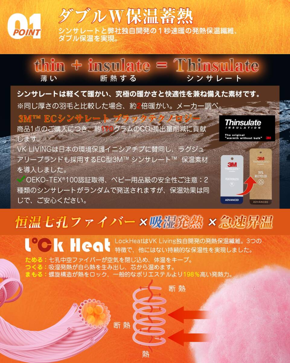 【シンサレート全面使用】シンサレートは軽くて暖かい、究極の暖かさと快適性を兼ね備えた素材です。同じ厚さの羽毛と比較した場合、約2倍暖かい。VK LIVINGは日本の環境保護イニシアチブに賛同し、2025年からラグジュアリーブランドも採用するEC型3M シンサレート 保温素材を導入しました。商品1点のご購入につき、約170グラムのCO排出量削減に貢献します。ぬくもりとエコの調和を実現します。ご注意:2種類のシンサレートがランダムで発送されますが、保温効果は同じで、ご安心ください。