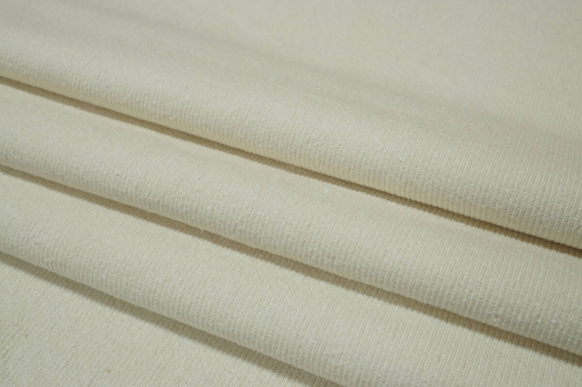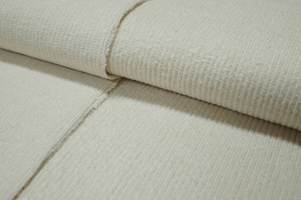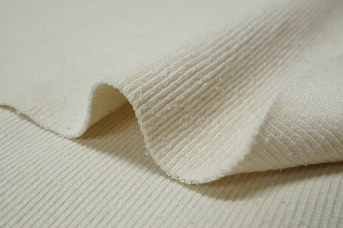 絹紡糸をつくる際にできる、ノイルとよばれるシルクのくずを原料にして紡績した糸のノイルシルク スパンテレコ(リブ編み)ニット生地の出品でございます。
