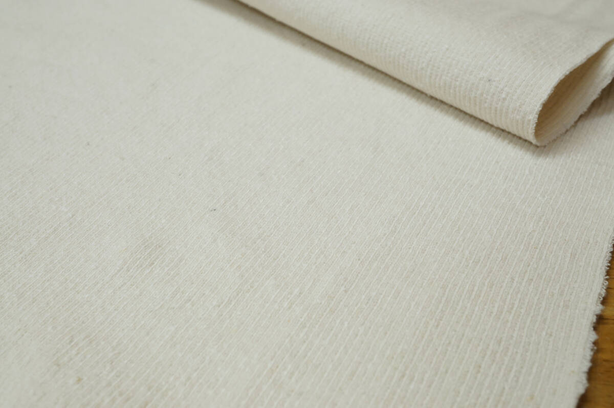 シルク・スパン混、微厚、ややソフト系、1way伸縮、色調:生成で、シルク独特の光沢感やきしみ感はなく、ぼそぼそっとした毛羽感のあるヴィンテージな雰囲気でございます。
