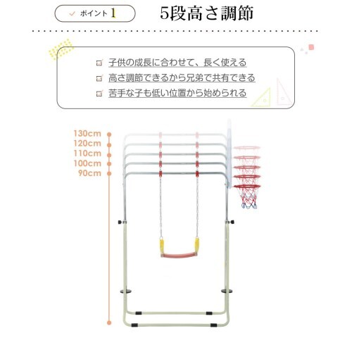 • 【やさしさポイント】01ブランコ装着時、安全にあそぶために、チェ一ンと支柱の間隔を広めに空けています。02お子様の成長などに合わせて、高さを5段階に調節できます。03床の傷つきを守る!ベ一スパイプにゴムのカバが四か所ついており、しっかりと鉄棒を固定し、床の傷、ズレの軽減になります。