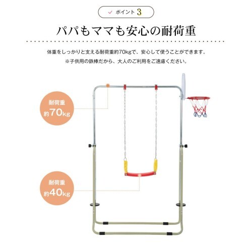 • 【安全さポイント】 1 三角形安定構造 ベースの幅が広くて大きくて、滑り止めもママにも安心! 2 滑り止め ベ一スパイプ各四ケ所にはゴムの滑り止めがついており、しっかりと鉄棒を固定します。 3 微調整が可能です アジャスタ一で微調節が可能で、ガタつきがある場所での使用も安心! 4 パパもママも安心の耐荷重! 鉄棒の耐荷重 70KG ブランコの耐荷重 40KG