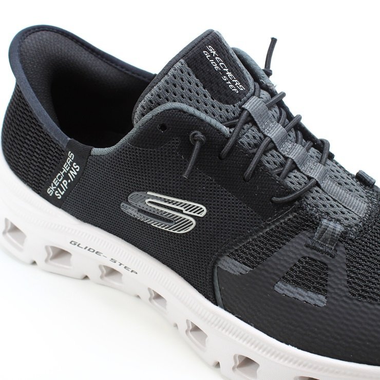| 立ったままハンズフリーで靴の脱ぎ履きが可能なSLIP-INSモデル。 メッシュアッパーにホットメルト加工を施した合成素材のオーバーレイ、低反発素材のSkechers Air-Cooled Memory Foam(スケッチャーズ エアクールドメモリーフォーム)コンフォートインソール、幾何学的でクッション性のあるGlide-Step(グライドステップ)ミッドソールが特長のバンジーレースシューズ。 | |