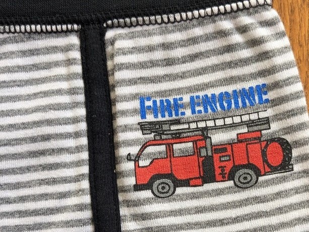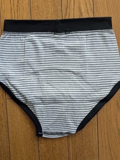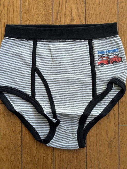 新品未使用の男児用ブリーフで、サイズは160です。色はゴムの部分がブラックで、グレーとホワイトのボーダー柄、消防車と英字(FIRE ENGINE)によるワンポイントのデザインがあります。本商品はニッセンの通販で何枚かセットで販売していたものの1枚で、使用せずに長期間タンスに保管していたものですので、袋はありません。長期保管による折り目がついていますが、目視したところ目立った染みもないので、保存状態はいいと思います。
