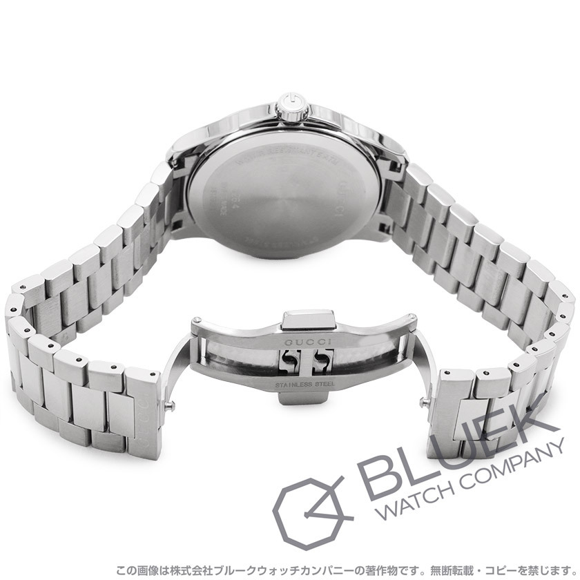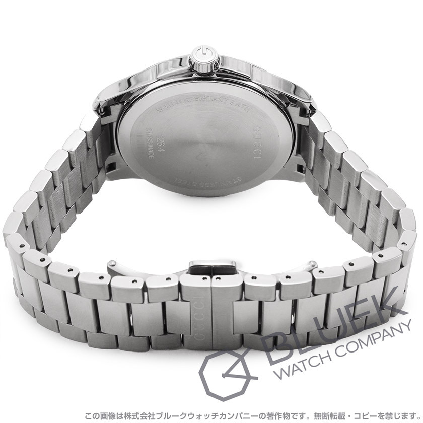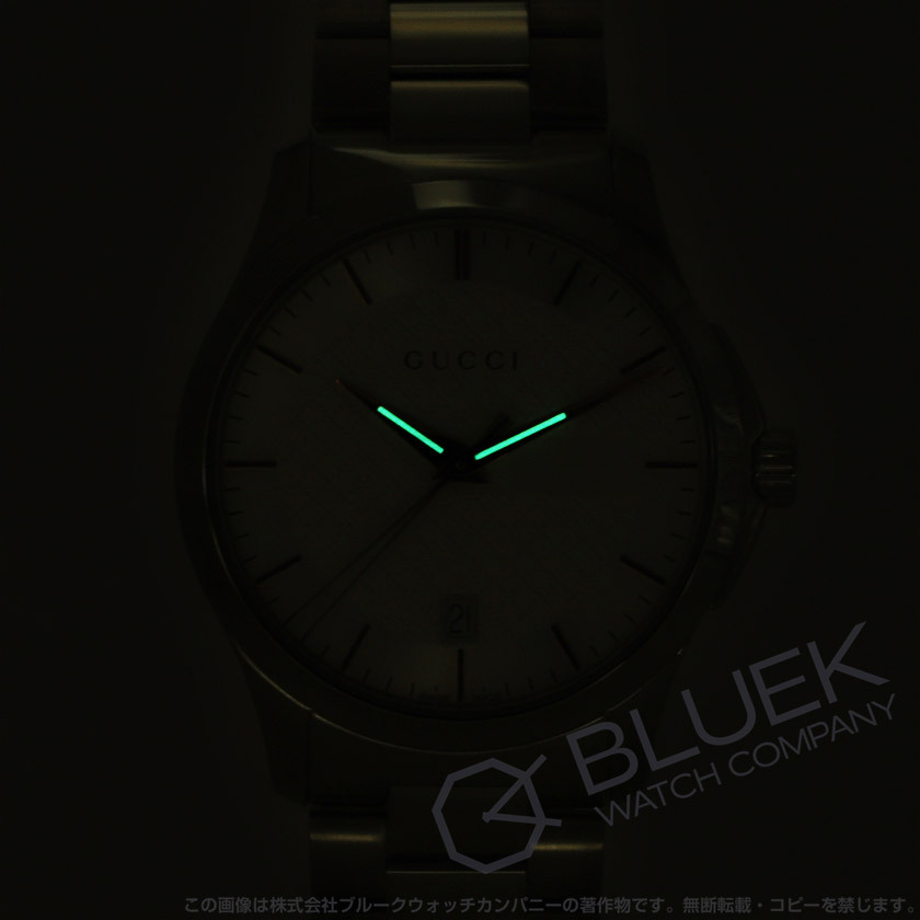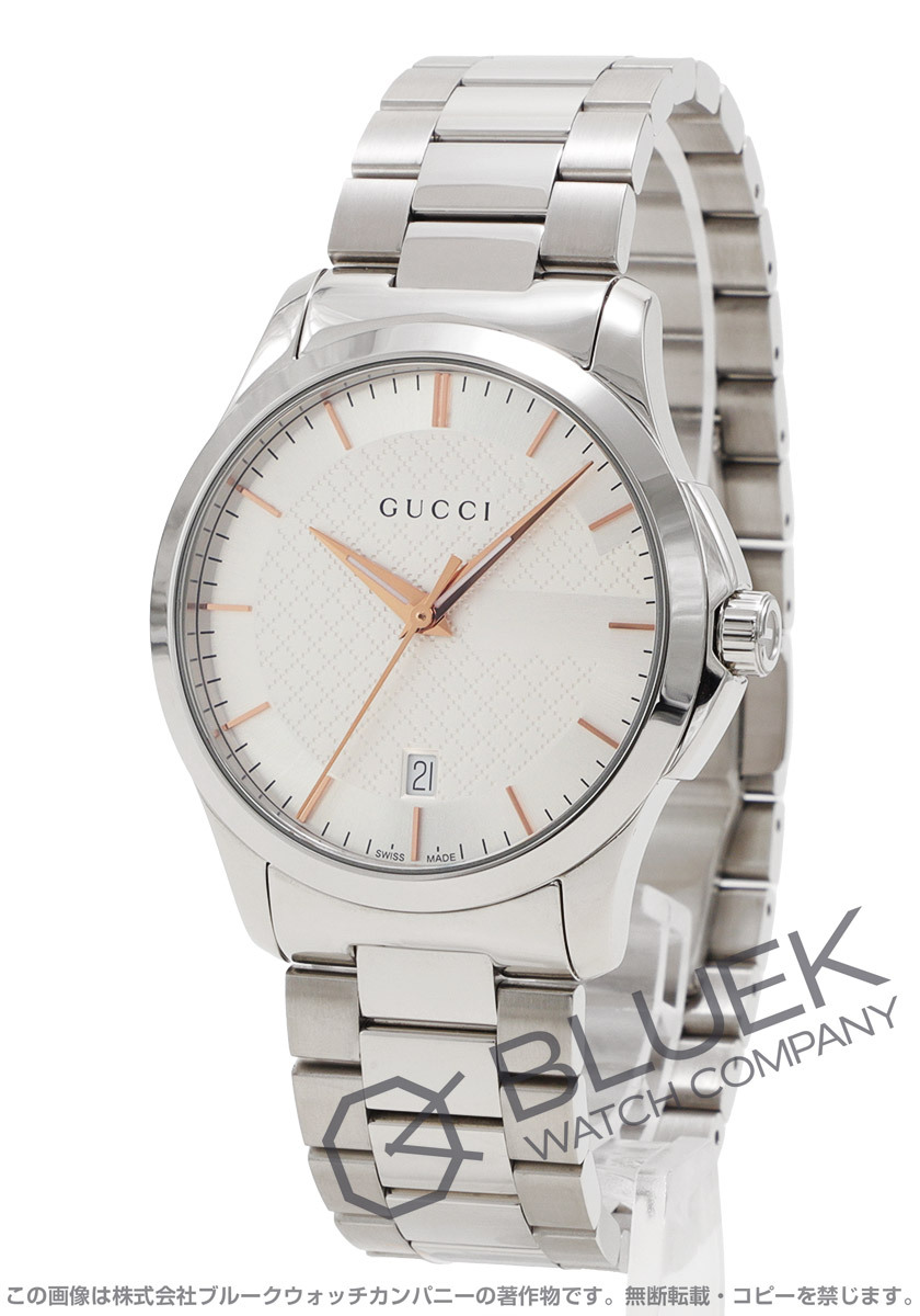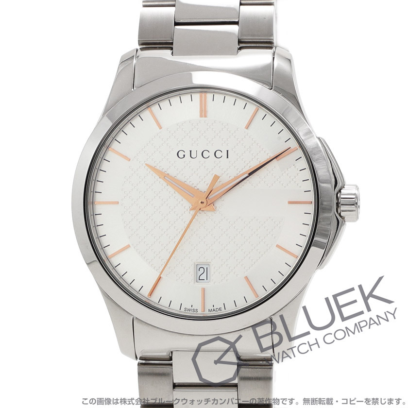 | 光沢シルバー艶やかな厚さ9ミリの38ミリケース&モダンな3連ブレスにピンクゴールドの指針&細いバーインデックス引き立つシルバーダイヤルを合わせたGタイムレスは、気品漂うダイヤルが紳士の手元を爽やかに彩るグッチ人気のクオーツモデル。菱形ギョーシェ模様&外周Gマークが施されたダイヤル6時に日付を表示し、指針には蛍光塗料が塗布されて暗所でも視認性を発揮します。中でも薄型ながらリューズガードを備えて誤作動を防ぐこのモデルは、プッシュ式両開きバックル付き3連ブレスも魅力。グッチのクラス感を手元で香らせてオンオフ活躍します。 |