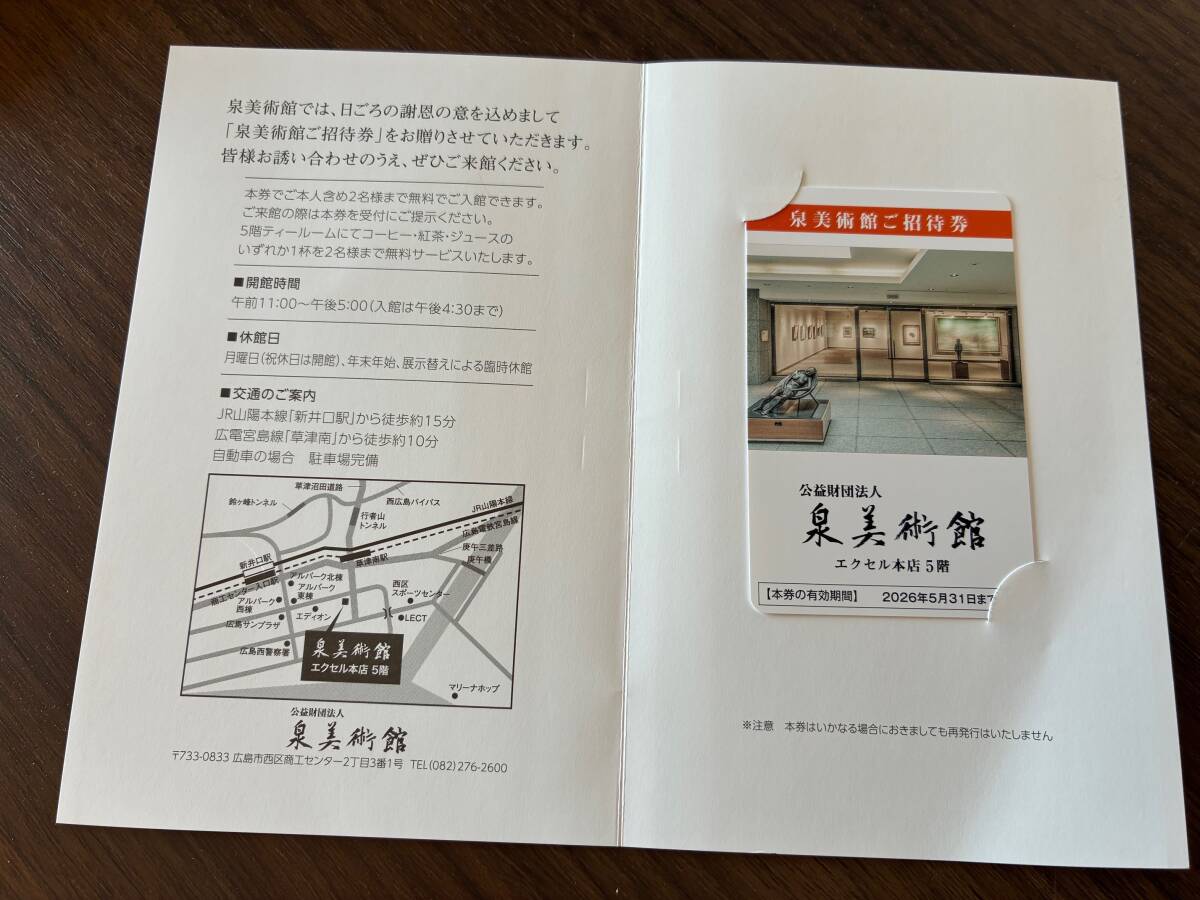 「泉美術館ご招待券」です。 ・本券の提示で、2名様まで無料で入館できます。 ・5階ティールームにてコーヒー・紅茶・ジュースのいずれかを無料サービス