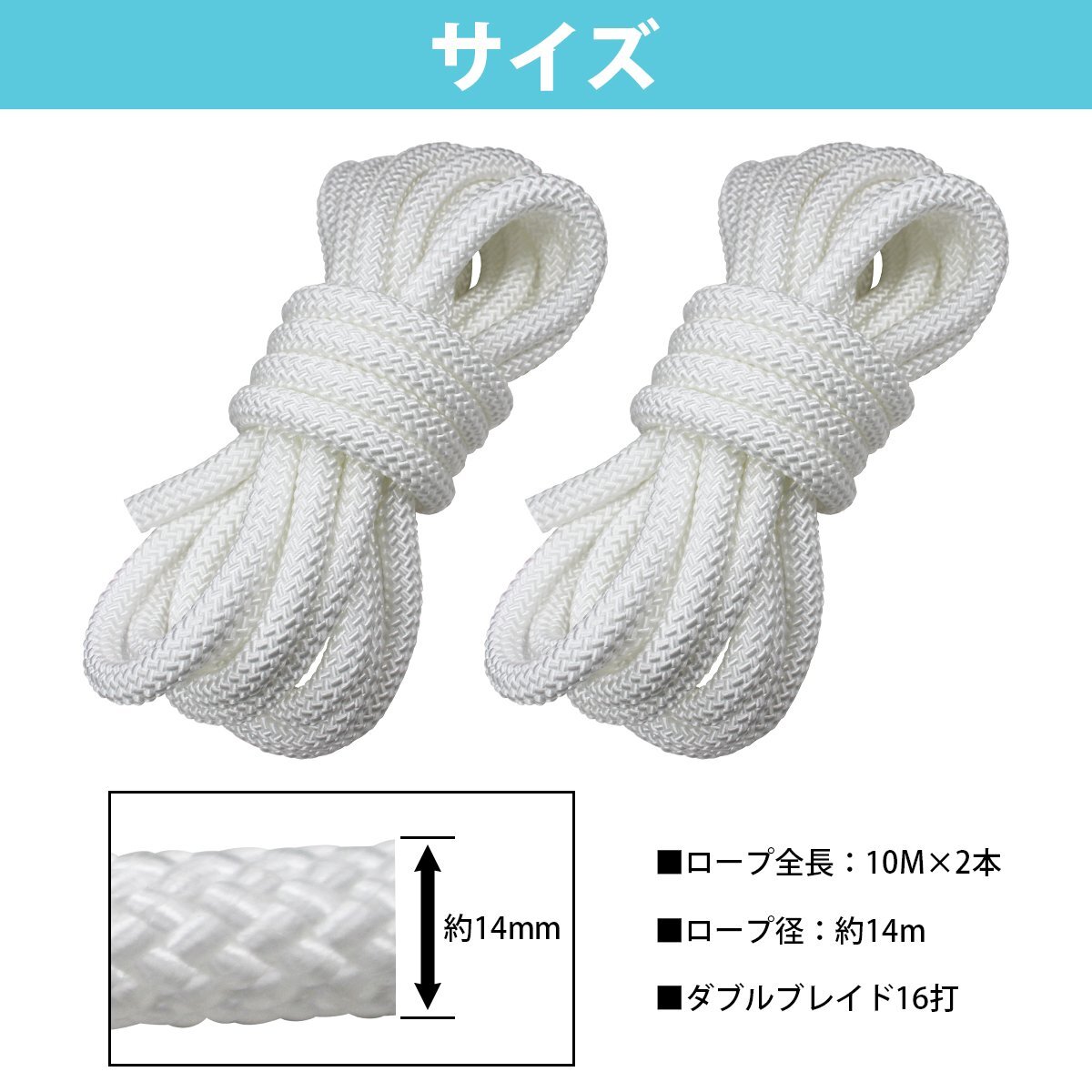16打 14mm 10m 2本セット 計20m 係留ロープ フェンダーロープ ダブルブレイド 白/ホワイト マリン ロープ 船 係船 14ミリ
