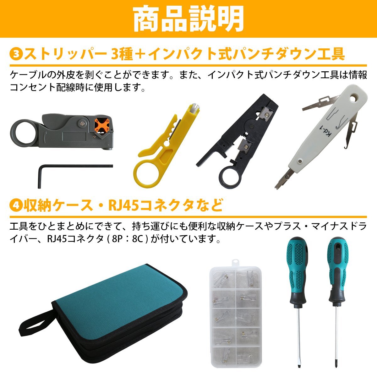 LAN ケーブル 自作 工具 セット RJ45 モジュラー コネクター 圧着ペンチ プラグ+かしめ加工+テスター ケース ラン コード