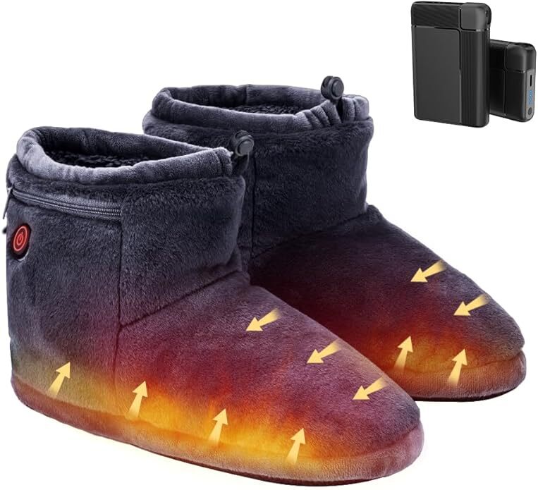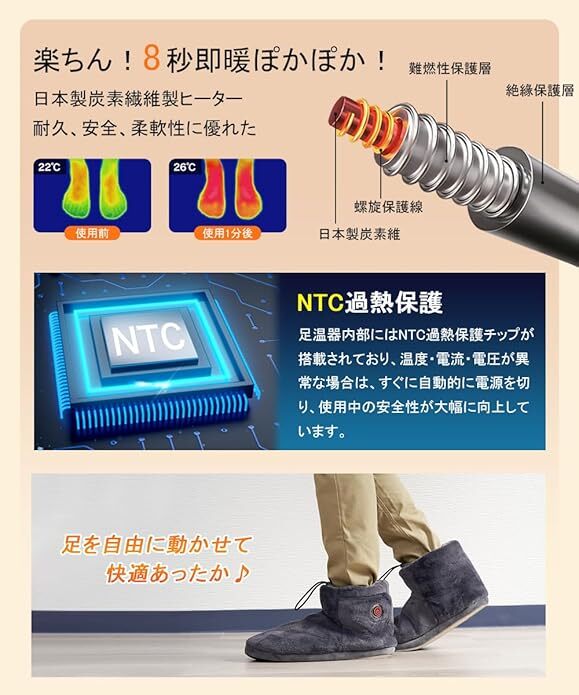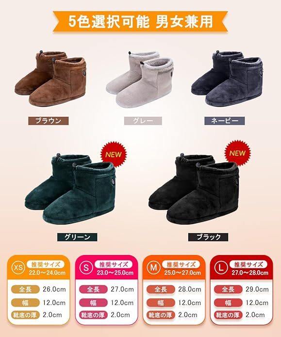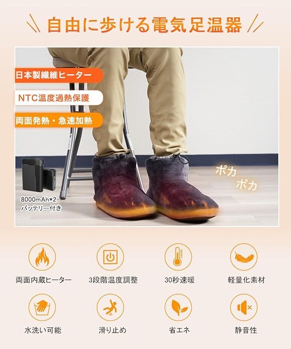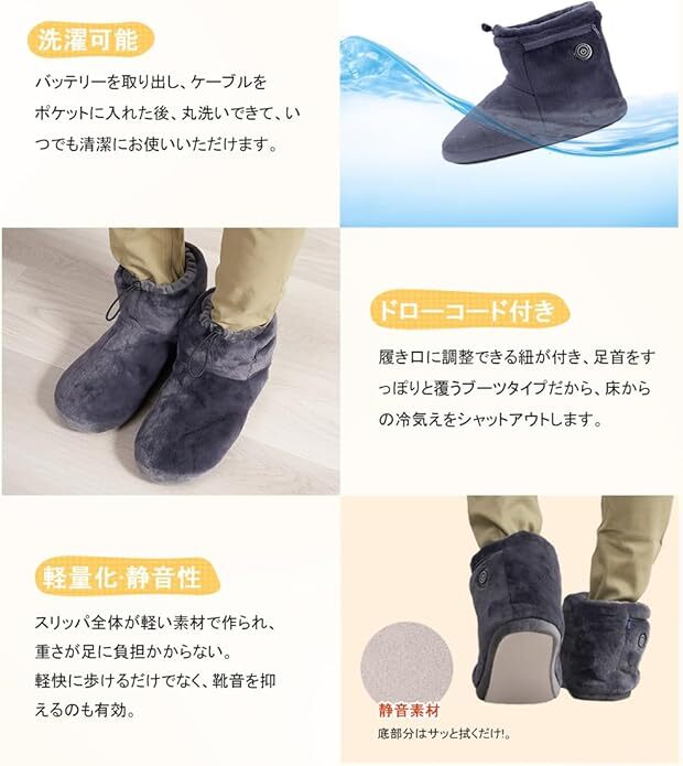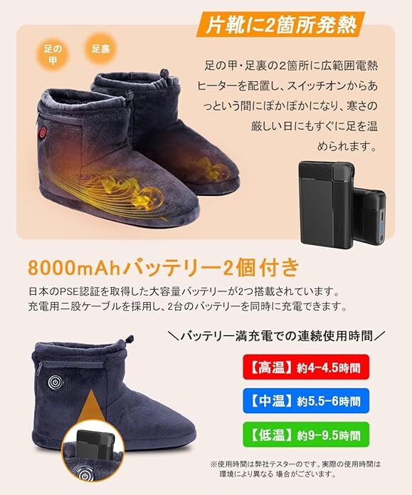 【あったか&ふわふわ】今年最新モデルの電気スリッパは、さらに寒い冬に備えて、昨年よりもっと多くのモコモコの素材を増やしました。改良点①:昨年の5000mah電池から8000mah大容量電池にアップグレードし、使用時間が大幅に向上した。改良点②:靴底にはより頑丈になりました。改良点③:XSサイズを追加しました。落ち着いた色調の素材を使用した高級感ある仕上がりで、どんな雰囲気のインテリアにも素敵マッチします。防寒性に優れた素材で、暖かくて、蒸れなくて、快適にご使用いただけます。【両面急速発熱&3段階温度調節】本フットウォーマーは高品質日本製繊維ヒーターを採用し、発熱が早く均等に温かさが広がります。足の甲・足裏の2箇所に広範囲電熱ヒーターを配置し、スイッチオンからあっという間にぽかぽかになり、寒さの厳しい日にもすぐに足を温められます。3階温度調整あり、環境温度や自身ニーズに合わせて、温度を45℃から65℃までに細かく調整でき、ボタンの色で温度段階が一目瞭然で分かりやすいです。【軽量&コードレス】軽くてやわらかいルームシューズです。履き口に調整できる紐が付き、足首をすっぽりと覆うブーツタイプなので、床からの冷気とシャットアウトしながら、長時間着用しても疲れません。本体にポケットがあり、付属のバッテリーをポケットに入れれば、コードが邪魔にならず使用しながら自由に動くことができます。【静音設計&洗濯可能】靴底は静音素材で、衝撃を吸収してくれるため、足音を軽減し、歩いたときにパタパタと音がしません。不快な音がなし、フローリングの床も傷つけないの室内スリッパです。更に丸洗いできて、いつでも清潔にお使いいただけます。(洗濯前にバッテリーを取り出して、本体にあるDCケーブルをカバーしてポケットに入れ、ファスナーを締めてください。)【8000mAhバッテリー付き&多用途】日本のPSE認証を取得した大容量バッテリーが2つ搭載されています。充電用二股ケーブルを採用し、2台のバッテリーを同時に充電できます。消費電力は約10Wで、1時間あたりの電気代は僅か0.3~0.5円で、とても省エネでお金の節約になります。勉強、調理や家事など様々なシーンで大活躍。男女や年齢を問わずお使えるルームシューズで、結婚祝いや引っ越し祝い、新築祝いなどのプレゼントとして贈るのもおすすめです!