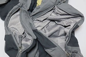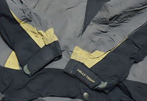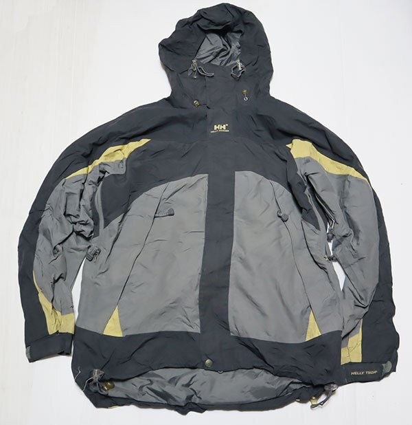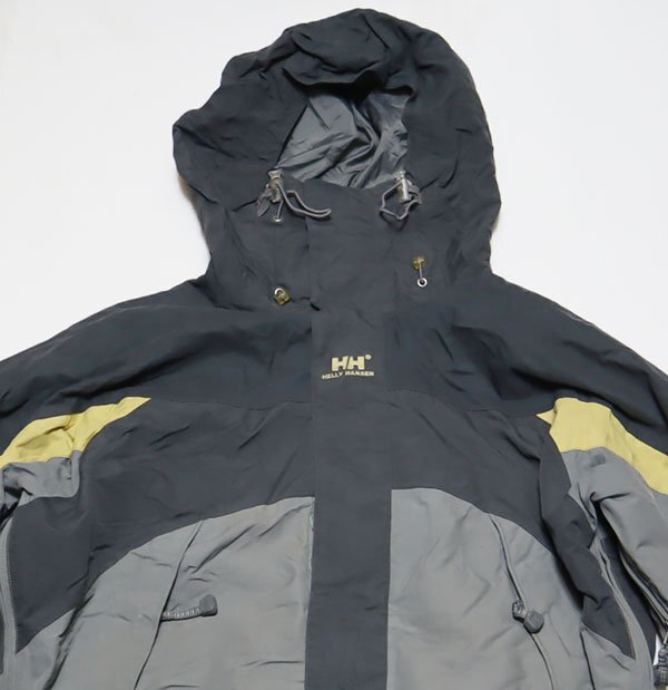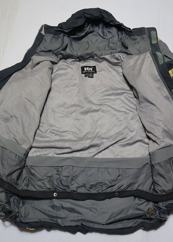 HELLY HANSENのナイロンジャケットのチャコールグレー系xグレー系xベージュ系で脇にはベンチレーション装備です。