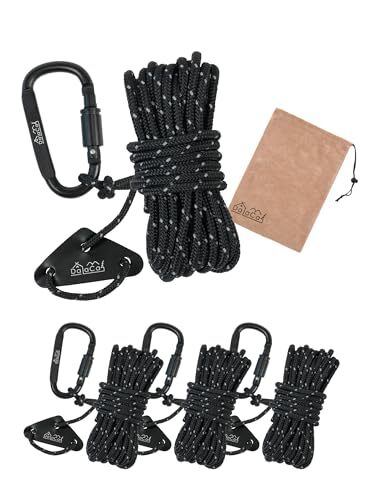 パラコード ガイロープ テントロープ タープロープ 反射材入り 太さ 4mm 長さ 4m 4本 / 8本 セット 耐荷重 300kg カラビナ 自在金具 収納袋 付き (ブラック, 4mm/4本)