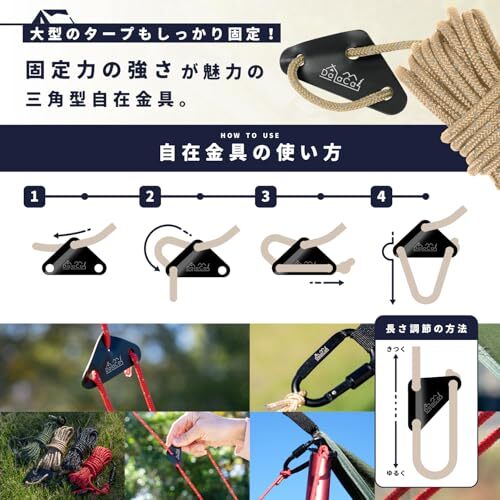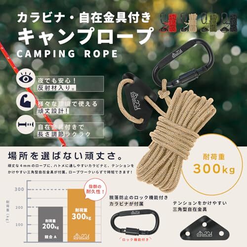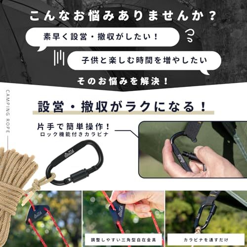 <キャンプが楽になる>設営時に頭を悩ませていた難しくて面倒な○○結びはもう不要!付属のカラビナでどこへでも簡単に脱着が出来ます!カラビナとロープは組合わせ済み!