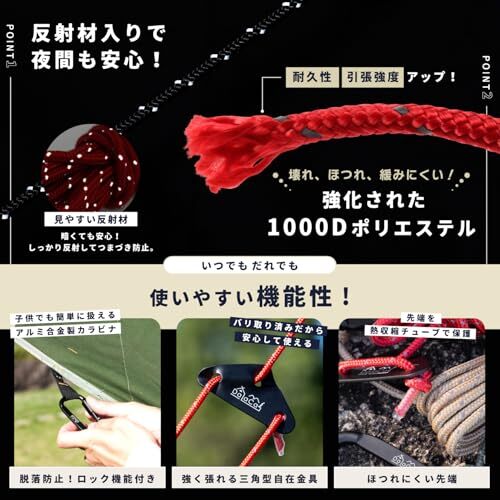 <業界最高水準の強度>ロープの材質は劣化に強い1000Dポリエステルです。耐荷重は300kg以上(弊社で計測済み)!どんな悪天候やどんな場所でも4mm設計のDaLaCaロープがテントやタープをしっかりと固定します。