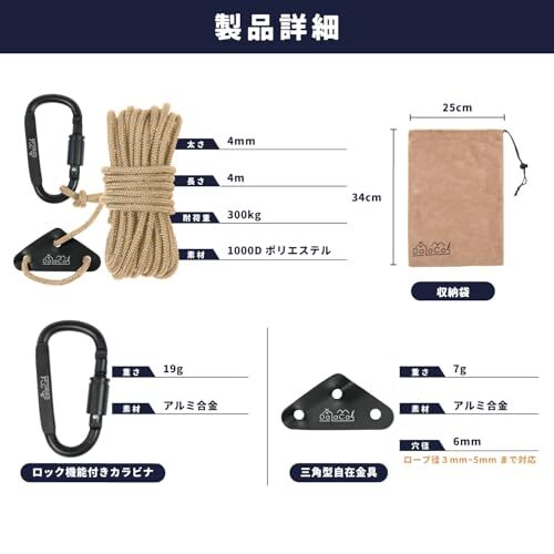 <セット内容>ロープ:太さ4mm長さ4m(1000Dポリエステル) 自在金具:7g(アルミ合金)カラビナ:19g(アルミ合金)収納袋