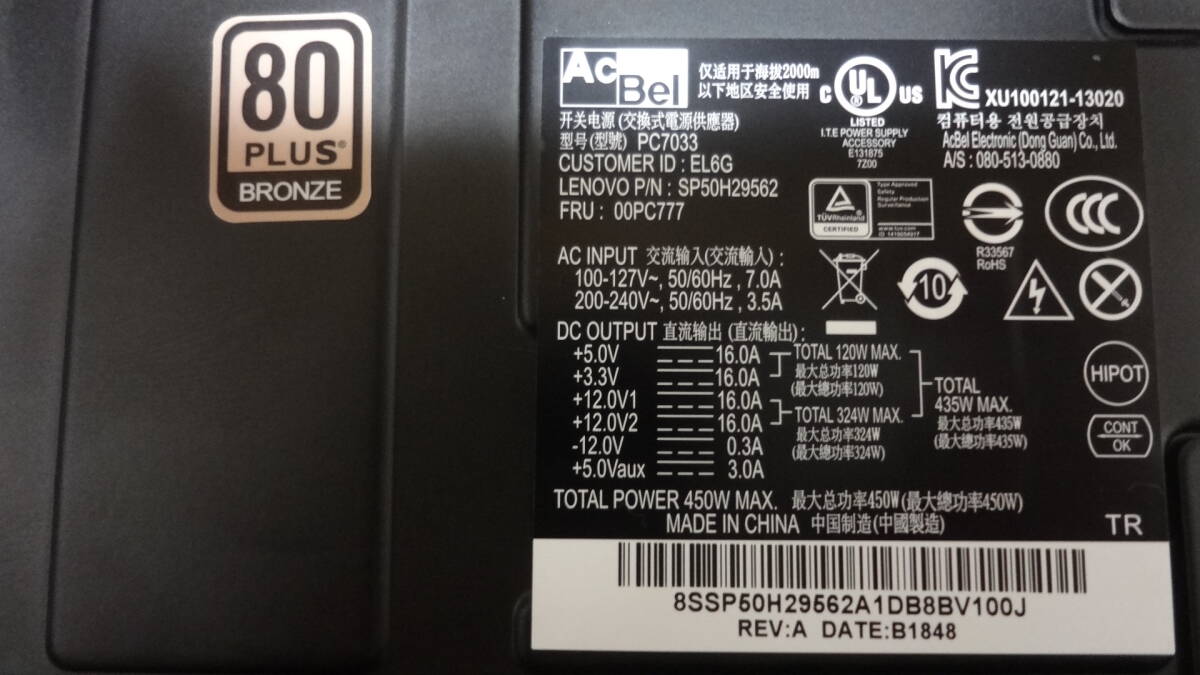 デスクトップPC用 AcBel製 型式PC7033 ATX電源 450W出力 80プラス ブロンズ認証 中古動作品