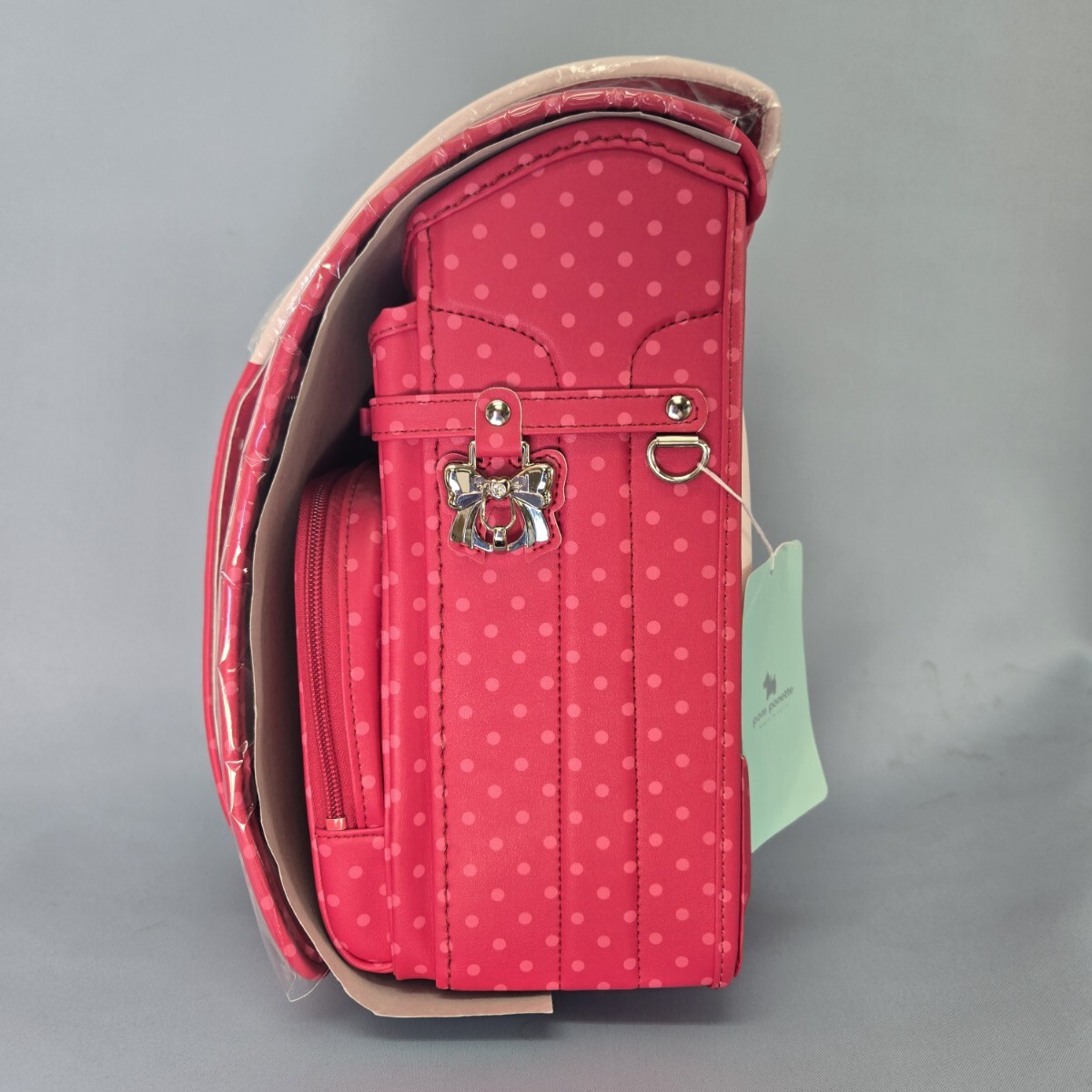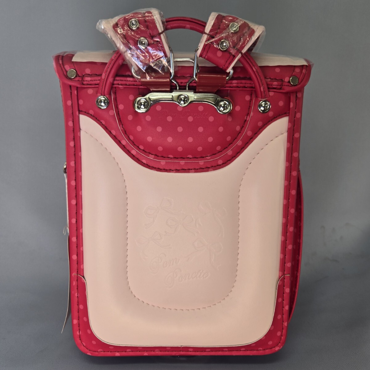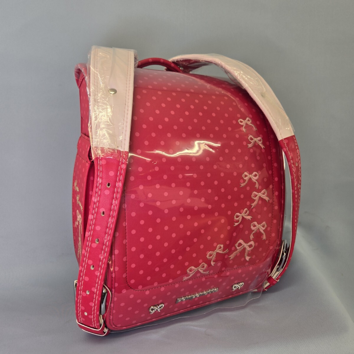 ピンクのドット柄にリボン刺繍が施されたランドセル。