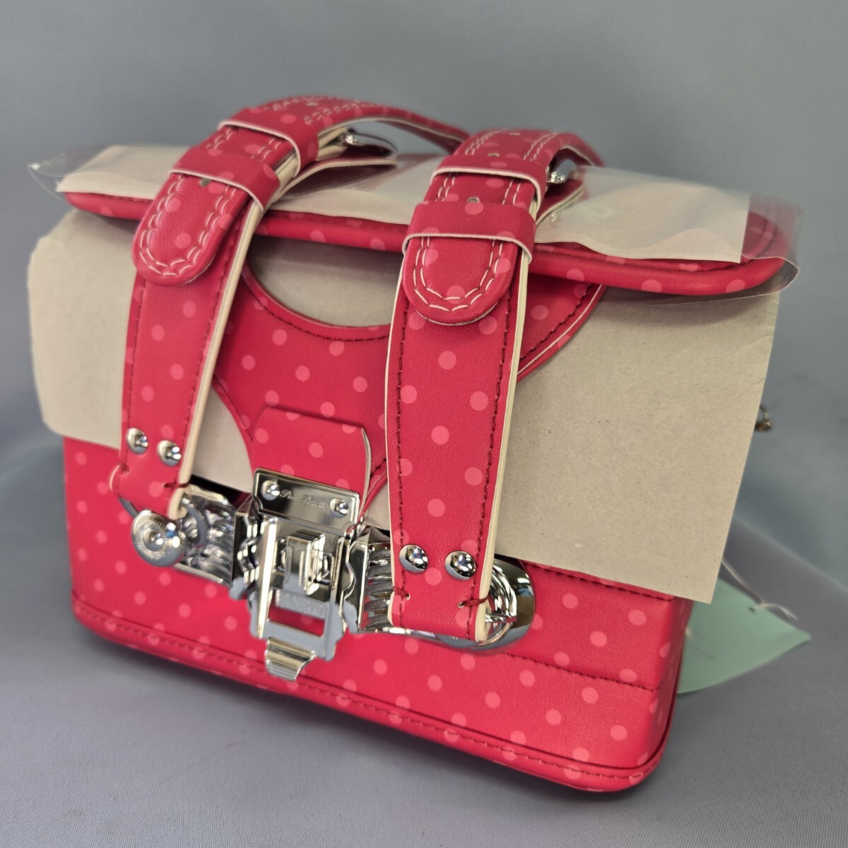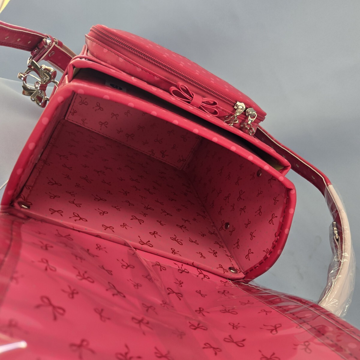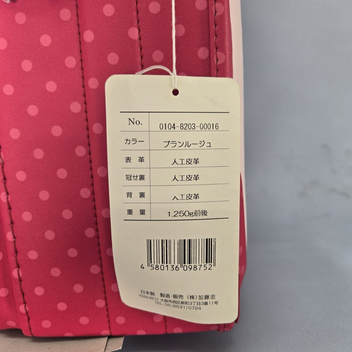 ピンクのドット柄にリボン刺繍が施されたランドセル。