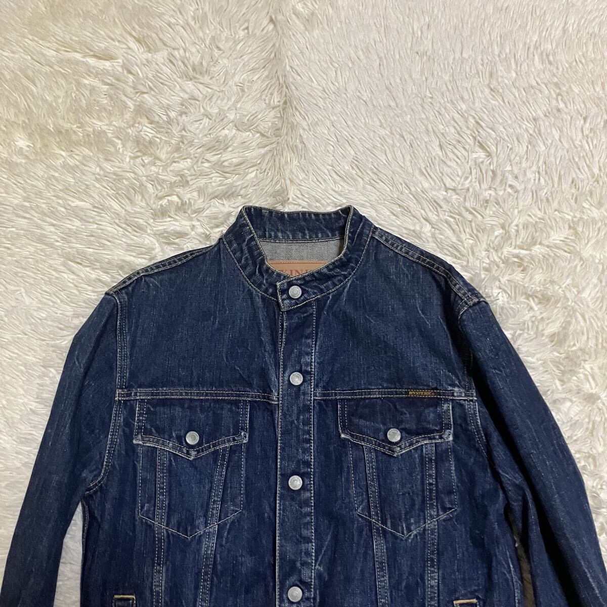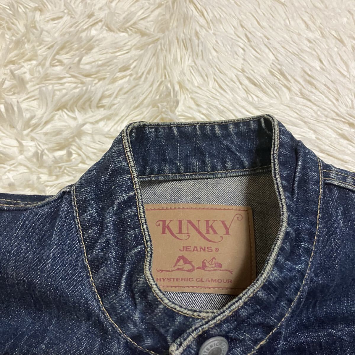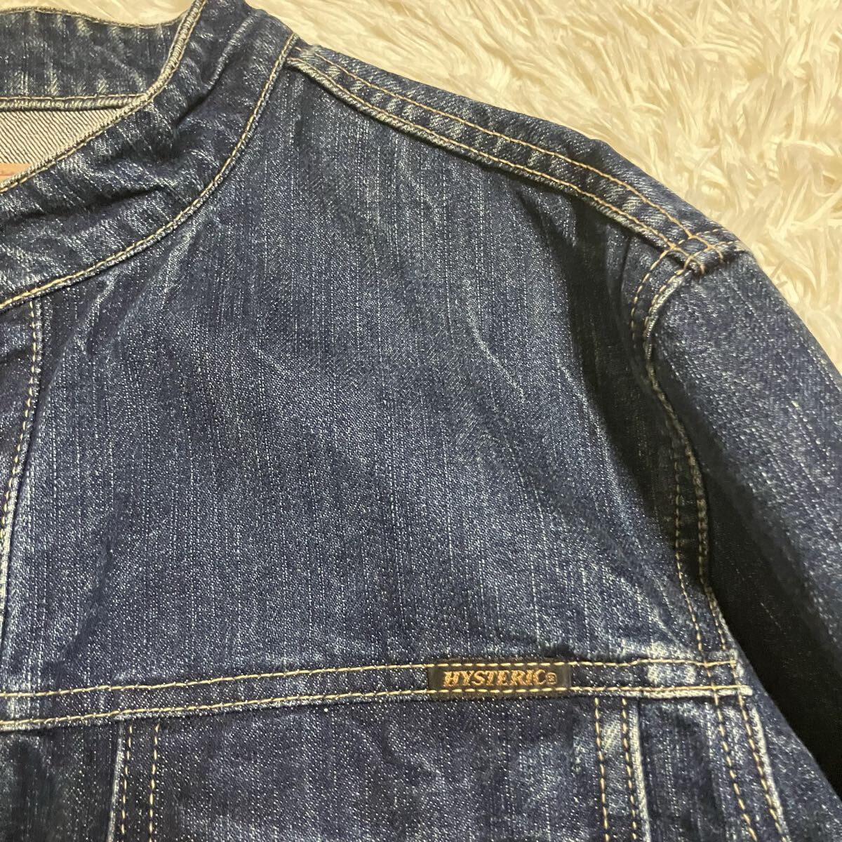 ヒステリックグラマーのデニムジャケットです。珍しいスタンドカラーのデザインで、スタイリッシュです。色落ちの加工もとても格好良いです。freeサイズは、ヒスは小さい物も多いですが、こちらは全体的に大きめの作りです。一般的なLサイズ程度あるかと思います。