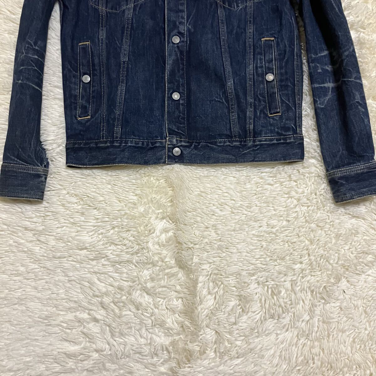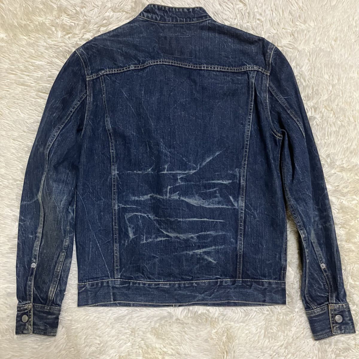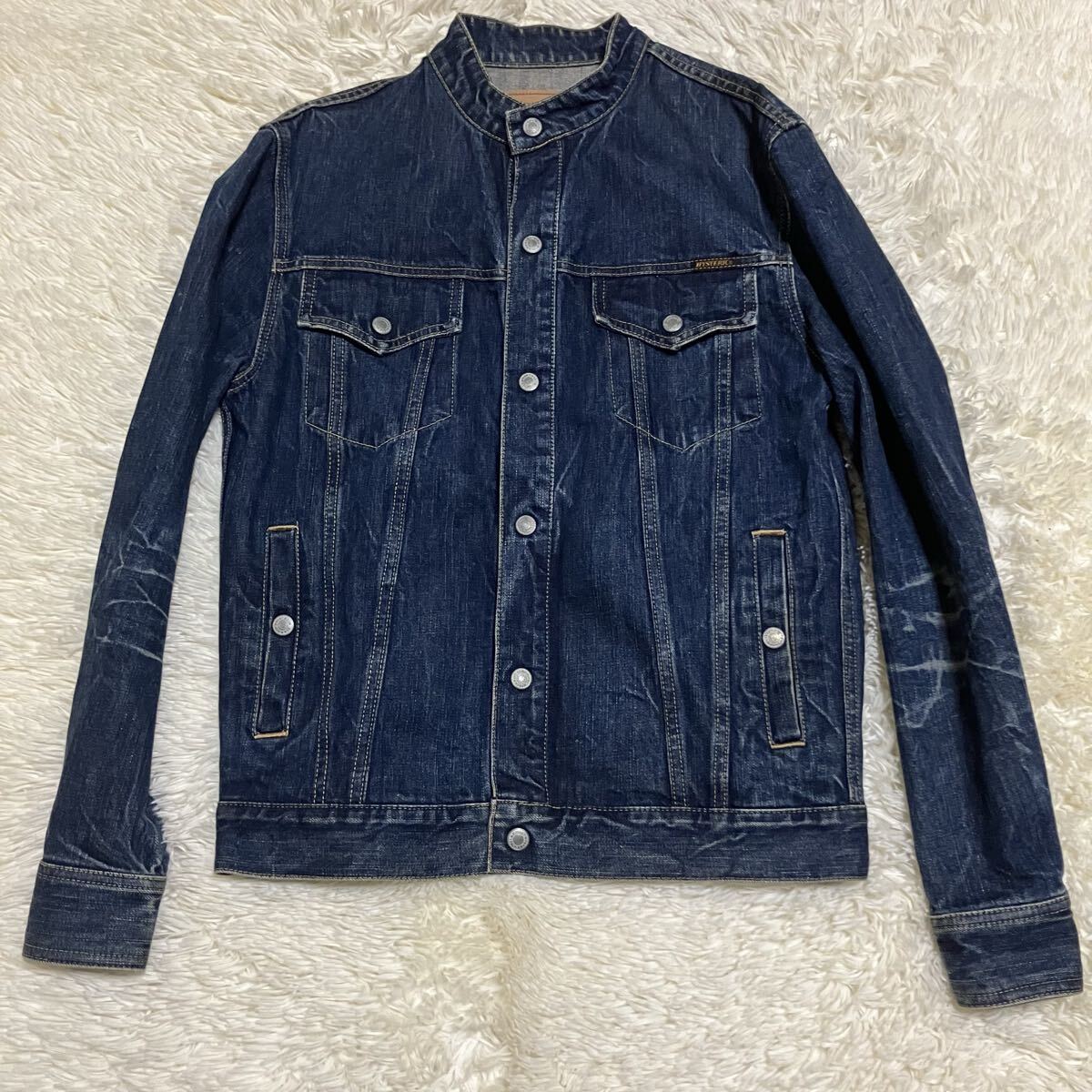 ヒステリックグラマーのデニムジャケットです。珍しいスタンドカラーのデザインで、スタイリッシュです。色落ちの加工もとても格好良いです。freeサイズは、ヒスは小さい物も多いですが、こちらは全体的に大きめの作りです。一般的なLサイズ程度あるかと思います。