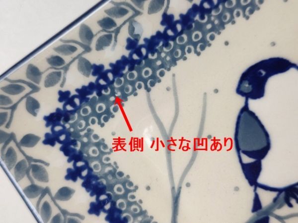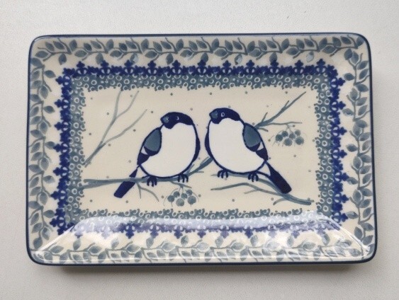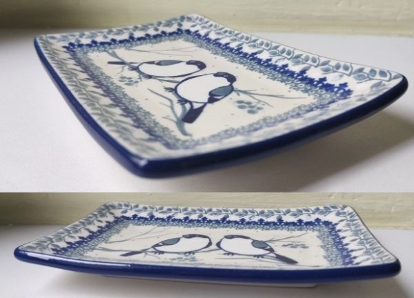 x989 ポーランド陶器 12x17.8cm 寿司/スクエア皿 藍/グレー/白 鳥 UNIKAT M.STARZYK ポーリッシュポタリー 食器