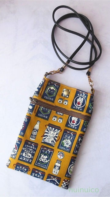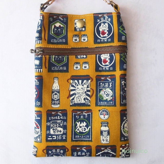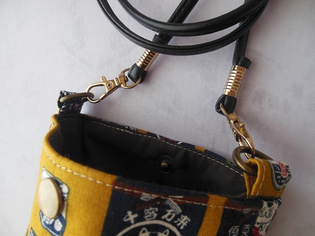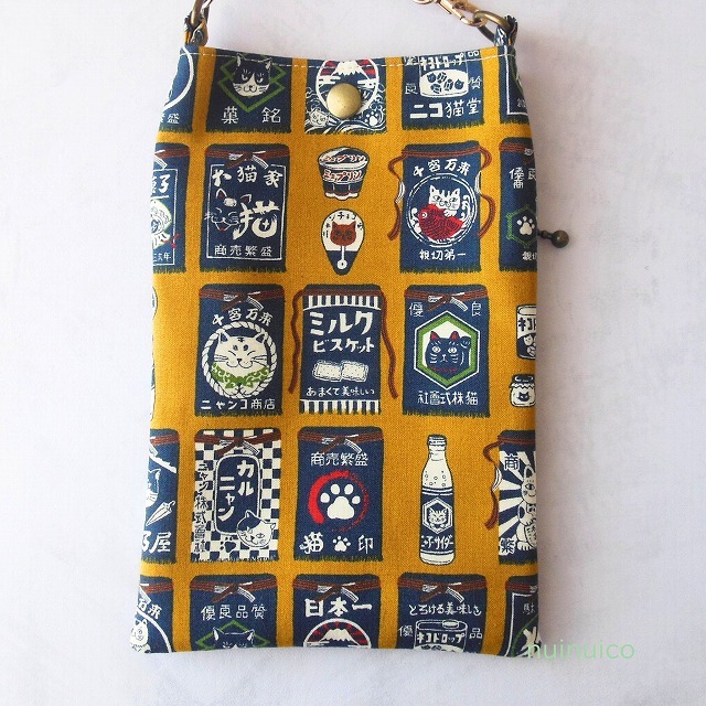 かわいい猫柄生地で作ったスマホショルダーです。お散歩でも活躍してくれる大きさです。
