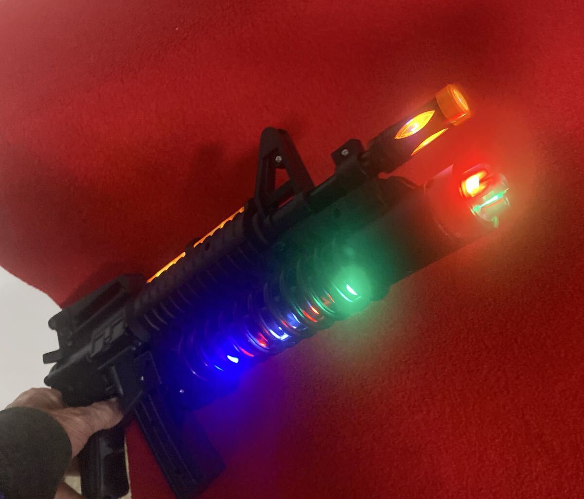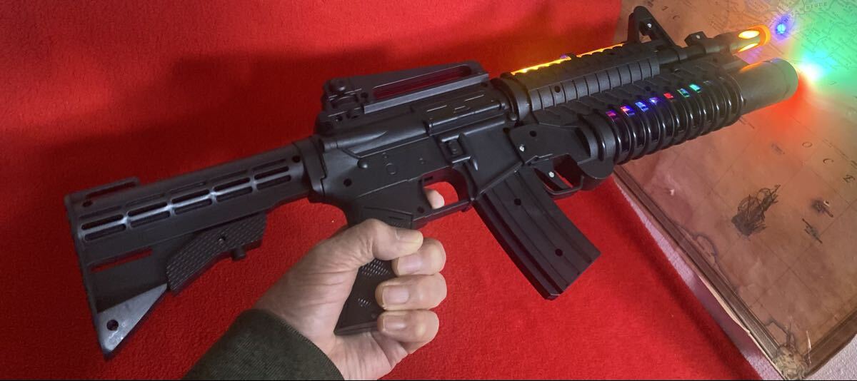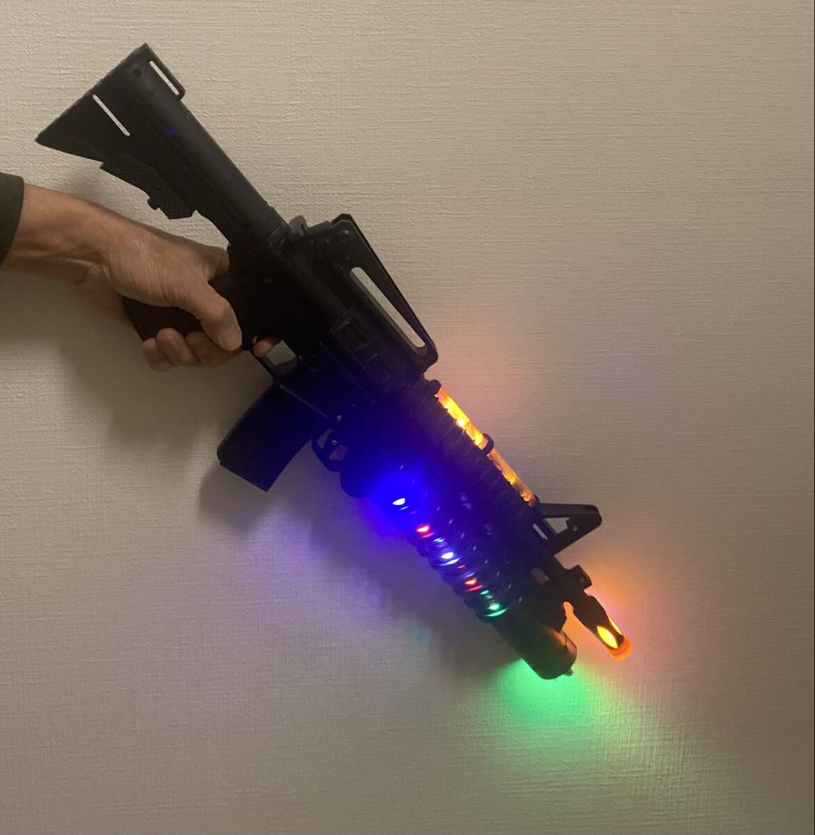 とてもお値打ち価格の 小物玩具は お子さまへのプレゼントやイベント、おまつり、子供会などで 景品等に重宝するものです レギュラーサイズとロングサイズのツーウエーで楽しめるマシンガンタイプのブラックカラーデザインのサウンドガン 本体のブラックカラーにオレンジラインがデザインされています 弾倉部分とストック カラーもオールブラックにデザインされています 本体リア部分にセットされているストックを装着すれば ツーウエーで遊ぶ事が出来ます引き金を引けばバギューン!と戦闘射撃音がランダムに響いて銃身が美しく光って先端のシルバーの部分がローリングすばしこく動き続けます!引き金を引きっぱなしにすれば綺麗に点滅して迫力の連続発射音が鳴り響きます!サウンドガンは先端上部が前後に激しく動いて銀色の部分が回転して 超かっこいいですね!光って迫力の戦闘音!光り物で楽しむ!光って回転!ローリングライフルの出品です ロングサイズで遊ぶ時は添付のストラップを付ける事が出来ます 引き金を引けば 美しいオレンジ色の光りを輝かせ 同時にエコーのかかった射撃音が迫力を増しています 電池交換可能な商品です テスト用電池が付属していますので すぐに遊べます とても安全な おもちゃの電動サウンドガンです 1丁の本体サイズ 全長 長さロングの場合545mm レギュラーの場合420mm 高さ170mm ハンドル部分の厚み30mm ジョイント部分30*45mm ストックのサイズ90*130*35mmシルバーの先端回転部分の直径30mm1個のパッケージ袋サイズ 210*440mm イベント、フェアー、景品などにご利用いただければ効果的です。新品 未使用 動作確認の上お届け致します 対象年齢6才以上です 宅配便にてお届け致します 宅配便配送料¥1000(中国地方5県はプラス¥200、東北地方6県、九州地方7県、四国地方4県はプラス¥300、北海道はプラス¥800プラス、沖縄へはお届け出来ません。出品させていただきました商品に限りましてはプチプチなどに包んで大切に お届けいたします ご安心くださいませ。お祭りや様々なイベントに楽しさを盛り上げる推しのイベントグッズが出品されています まとめて取引にも対応しています 下記出品ページを ご参照下さいませ タイトル「イベントにイチ推し!光り物で楽しむ!」でございます 尚 この商品には希望落札価格が設定されております。出品商品につきまして わからない事のある場合 お気軽にご質問欄にて ご投稿下さい 迅速に ご返答差し上げます*お取り引きに関しましての お願いです オークションのルールに従い 宜しくお願い致します*』