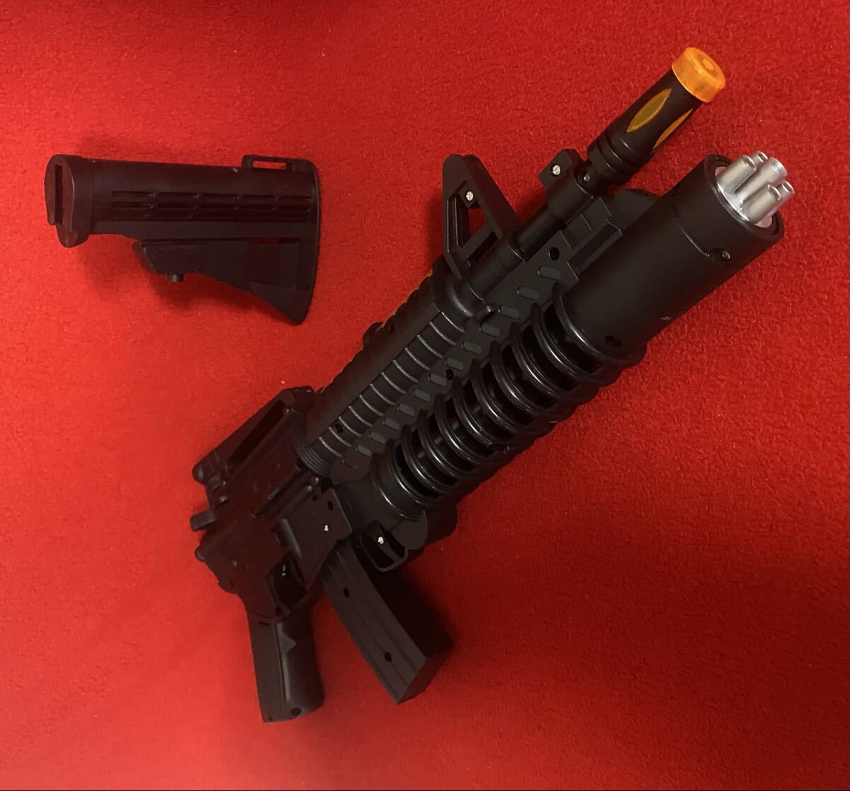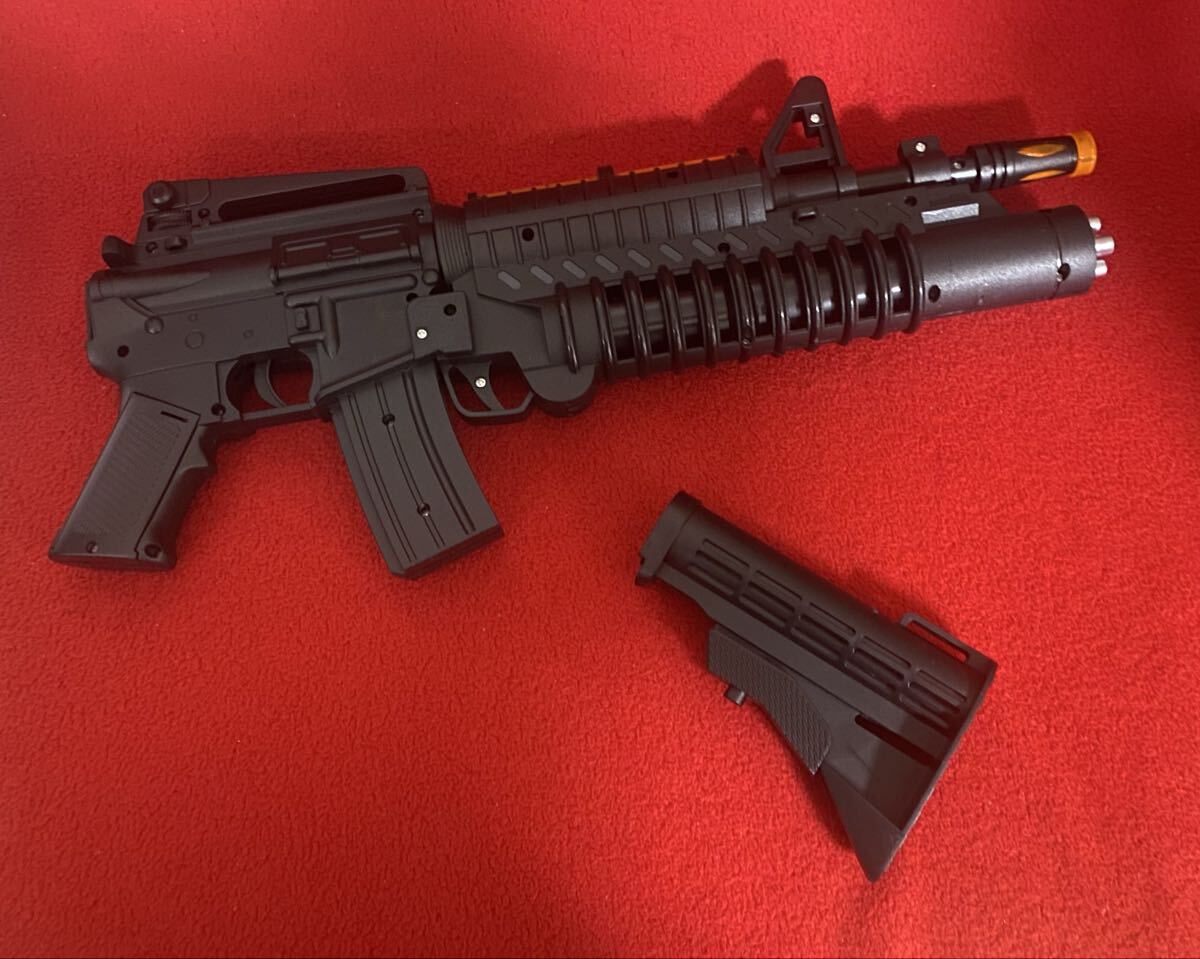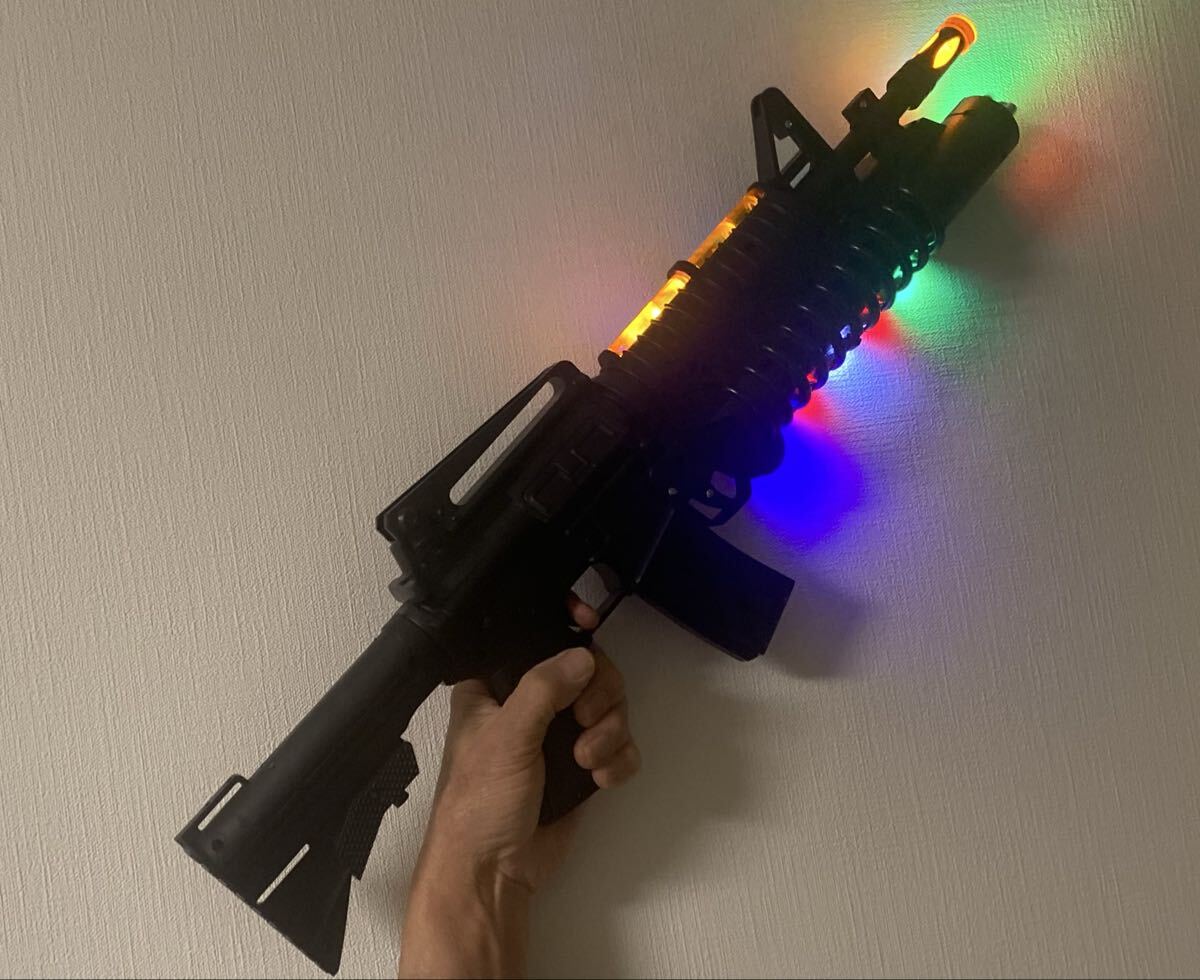 とてもお値打ち価格の 小物玩具は お子さまへのプレゼントやイベント、おまつり、子供会などで 景品等に重宝するものです レギュラーサイズとロングサイズのツーウエーで楽しめるマシンガンタイプのブラックカラーデザインのサウンドガン 本体のブラックカラーにオレンジラインがデザインされています 弾倉部分とストック カラーもオールブラックにデザインされています 本体リア部分にセットされているストックを装着すれば ツーウエーで遊ぶ事が出来ます引き金を引けばバギューン!と戦闘射撃音がランダムに響いて銃身が美しく光って先端のシルバーの部分がローリングすばしこく動き続けます!引き金を引きっぱなしにすれば綺麗に点滅して迫力の連続発射音が鳴り響きます!サウンドガンは先端上部が前後に激しく動いて銀色の部分が回転して 超かっこいいですね!光って迫力の戦闘音!光り物で楽しむ!光って回転!ローリングライフルの出品です ロングサイズで遊ぶ時は添付のストラップを付ける事が出来ます 引き金を引けば 美しいオレンジ色の光りを輝かせ 同時にエコーのかかった射撃音が迫力を増しています 電池交換可能な商品です テスト用電池が付属していますので すぐに遊べます とても安全な おもちゃの電動サウンドガンです 1丁の本体サイズ 全長 長さロングの場合545mm レギュラーの場合420mm 高さ170mm ハンドル部分の厚み30mm ジョイント部分30*45mm ストックのサイズ90*130*35mmシルバーの先端回転部分の直径30mm1個のパッケージ袋サイズ 210*440mm イベント、フェアー、景品などにご利用いただければ効果的です。新品 未使用 動作確認の上お届け致します 対象年齢6才以上です 宅配便にてお届け致します 宅配便配送料¥1000(中国地方5県はプラス¥200、東北地方6県、九州地方7県、四国地方4県はプラス¥300、北海道はプラス¥800プラス、沖縄へはお届け出来ません。出品させていただきました商品に限りましてはプチプチなどに包んで大切に お届けいたします ご安心くださいませ。お祭りや様々なイベントに楽しさを盛り上げる推しのイベントグッズが出品されています まとめて取引にも対応しています 下記出品ページを ご参照下さいませ タイトル「イベントにイチ推し!光り物で楽しむ!」でございます 尚 この商品には希望落札価格が設定されております。出品商品につきまして わからない事のある場合 お気軽にご質問欄にて ご投稿下さい 迅速に ご返答差し上げます*お取り引きに関しましての お願いです オークションのルールに従い 宜しくお願い致します*』