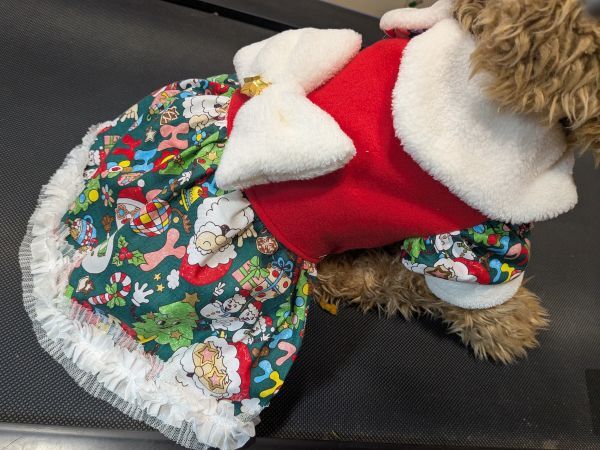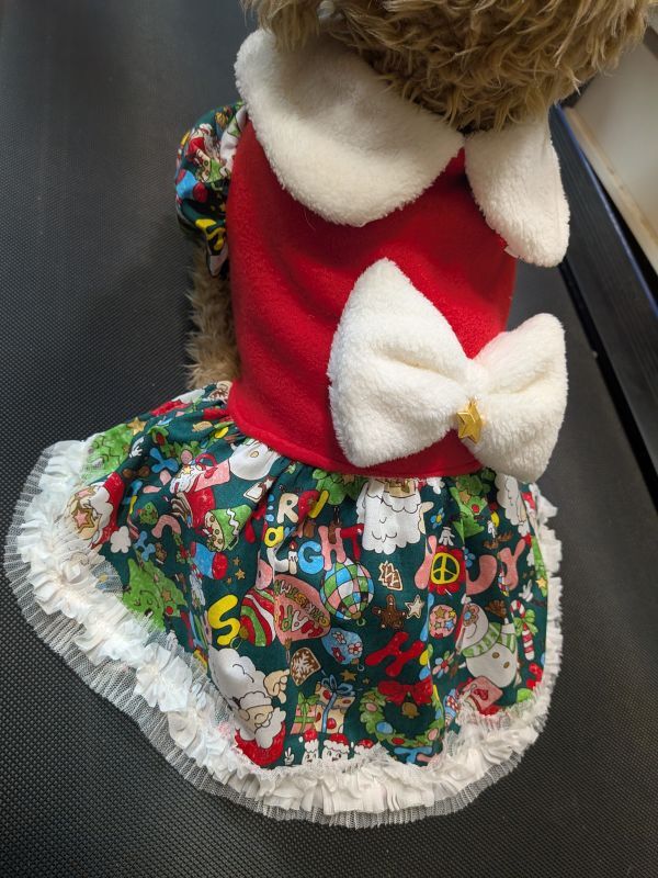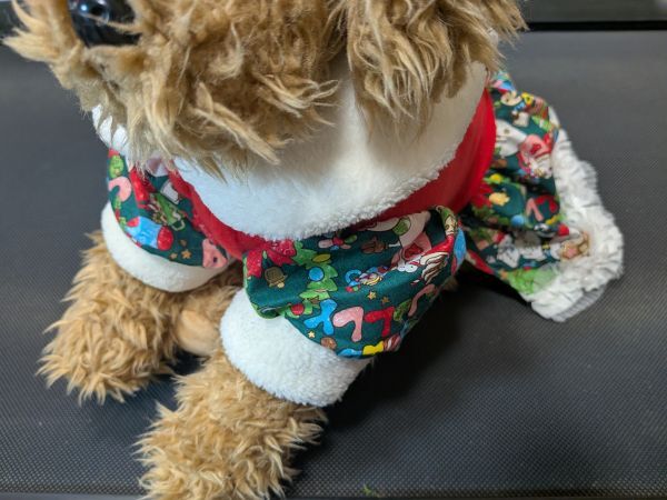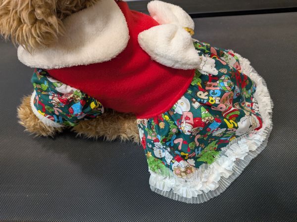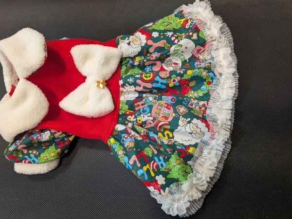 現品のみになります。赤のフリースに緑のサンタ柄のスカートとお袖のワンピを作りました、