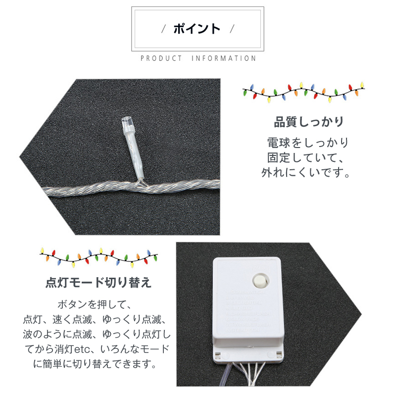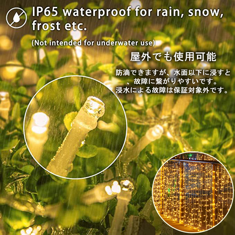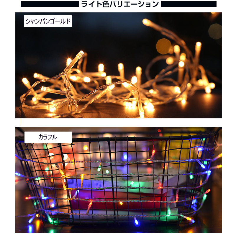 | 商品内容物:LEDイルミネーションライト×1ライトの色:シャンパンゴールド、カラフル どちらか選べる電球数:電池タイプは80球、コンセントタイプは100球 どちらか選べる給電方法:単3形乾電池3本またはコンセント電球間隔:10〜12cmコード長さ:10M点灯パターン:8種類材質:PVC+銅線防水加工:防滴型照度感知機能:なし特徴:コンセントタイプは2本繋いで延長可能。シンプルな模様で、幸せな雰囲気。子供も女性もお気に入りになるデザイン。シーン:部屋、レストラン、店舗の窓の飾り、屋根、庭、木、バルコニー、ベランダ、テラスなどの電飾、クリスマスツリー、パーティー、記念日ディナーの空間創りに活用できます。ご確認:モニター発色によって、商品の色や質感など、画像と実物は、多少異なる場合がございます。 |