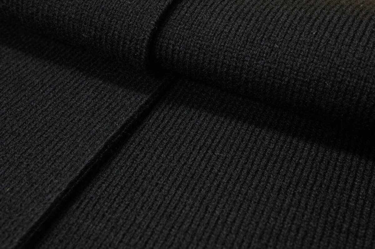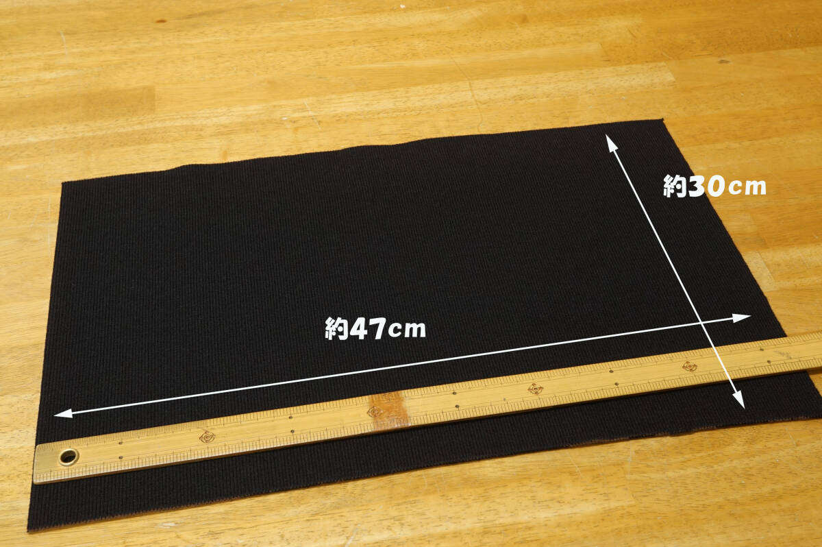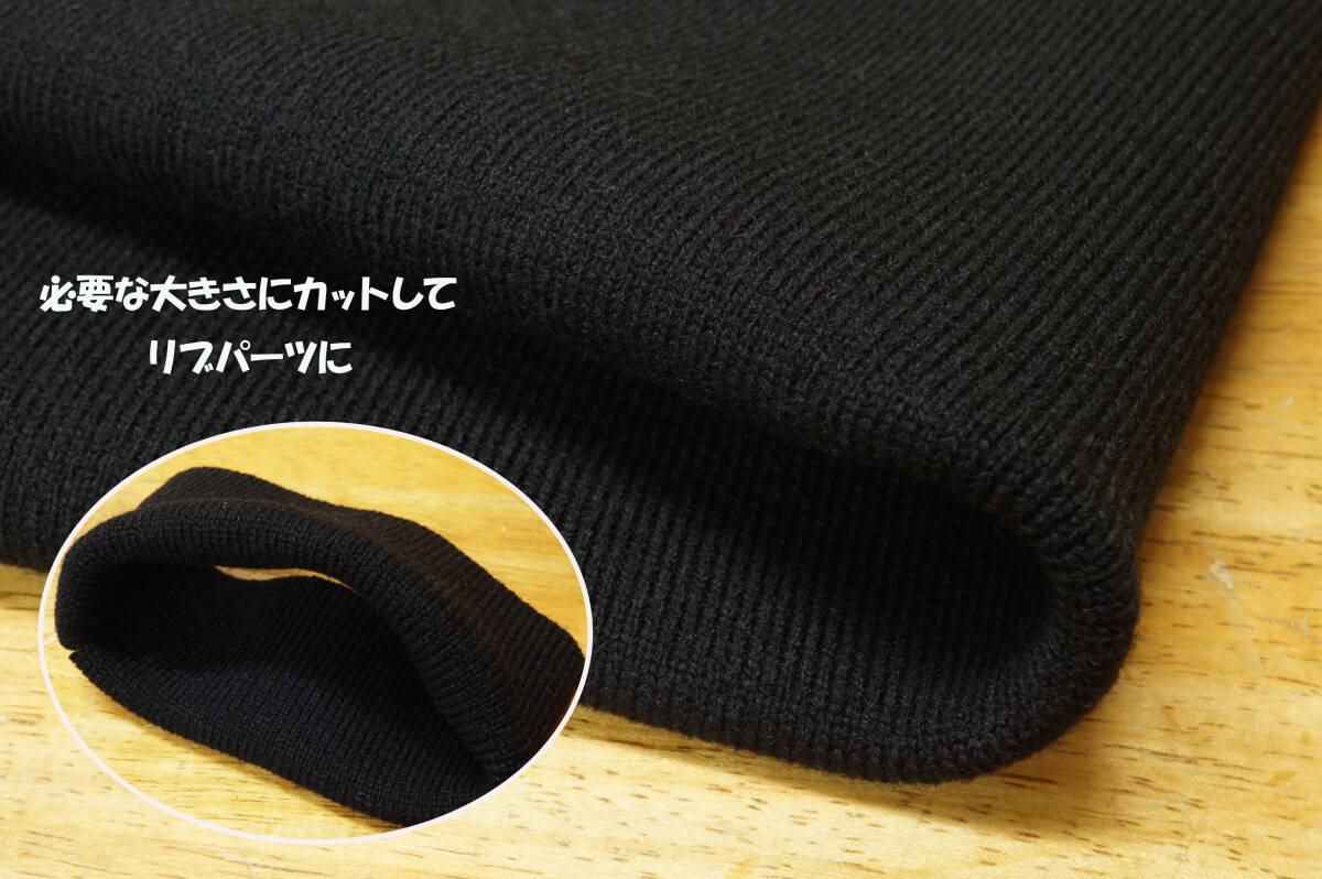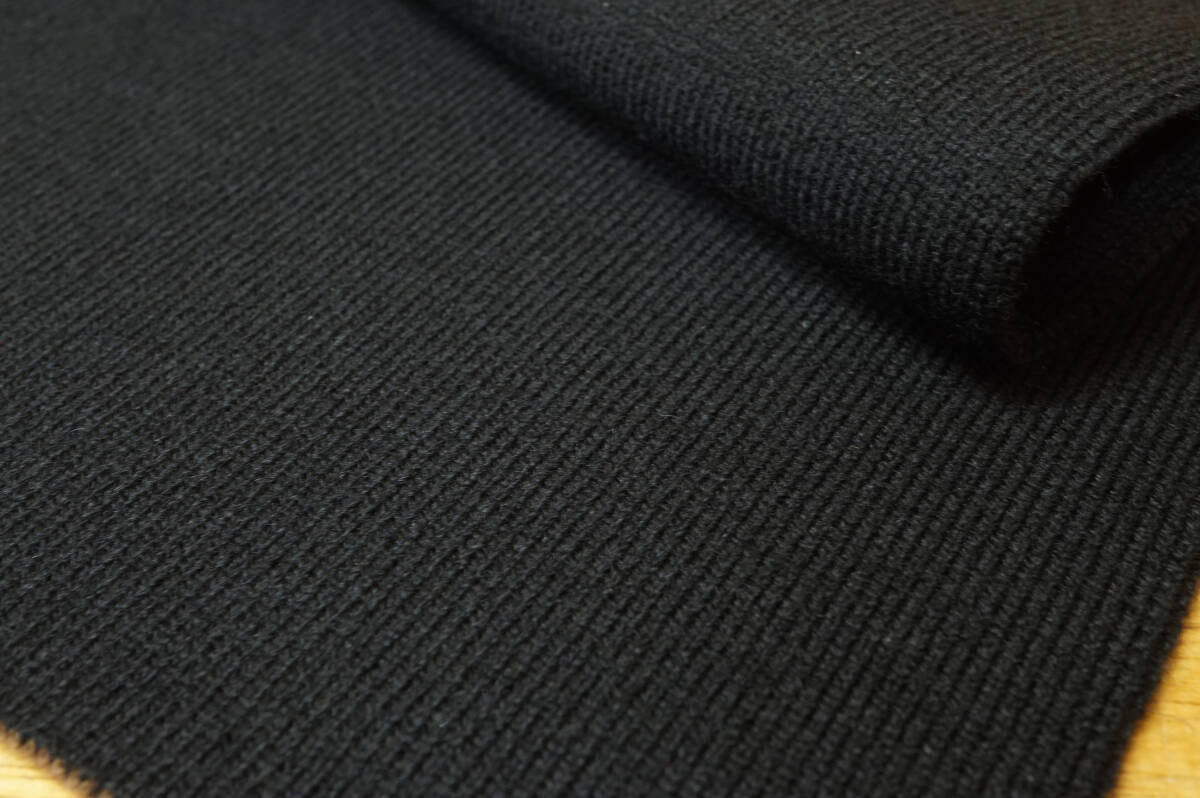 ウール・ポリエステル・ポリウレタン混、微厚、ややソフト系ではございますが程よいコシもあるパーツ用のリブ生地で、巾方向に1way伸縮、弱めの毛羽感、色調:ブラックで、1枚のサイズが縦約30cm×横47cmでございます。