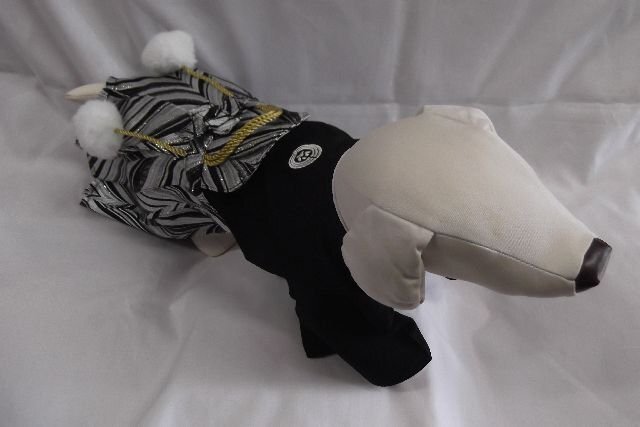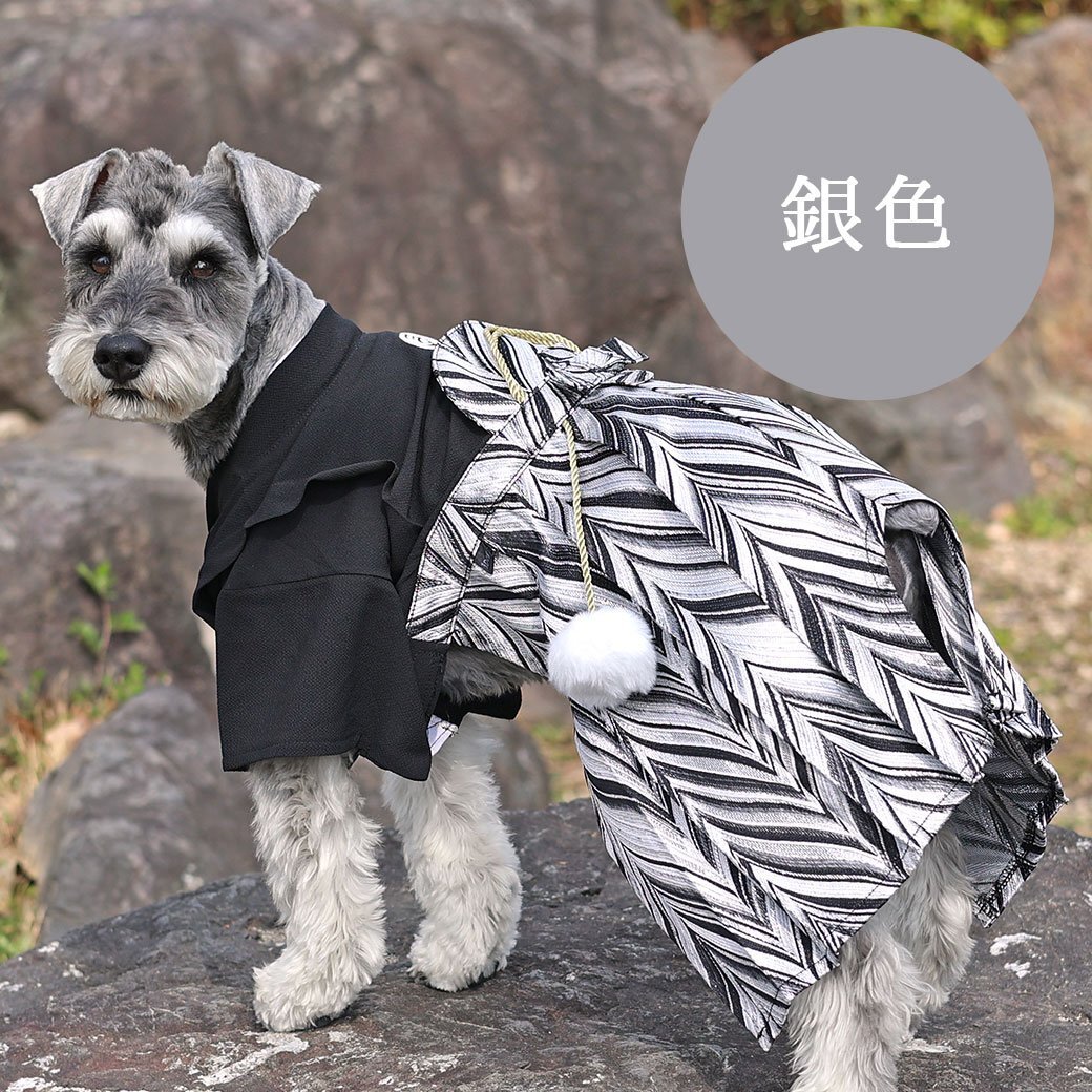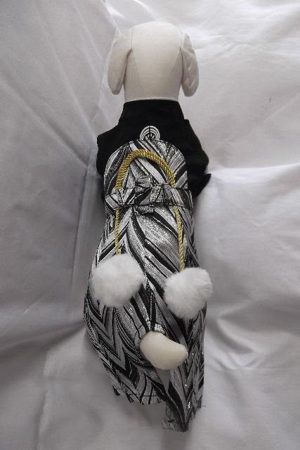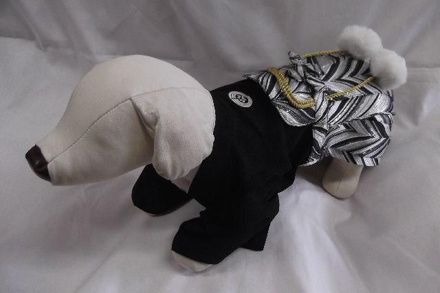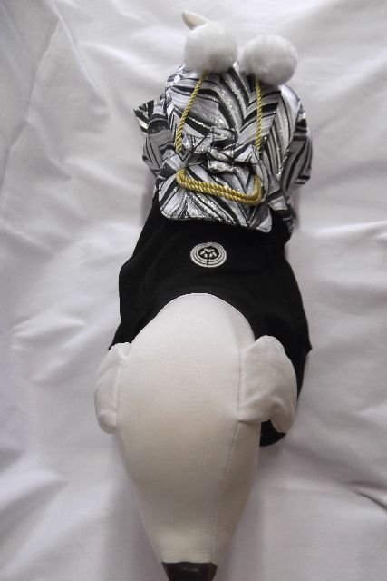 背中にはワンコの足跡の家紋入り、紐の先には羽織紐をイメージした ふわふわの白いぽんぽんが付いています。