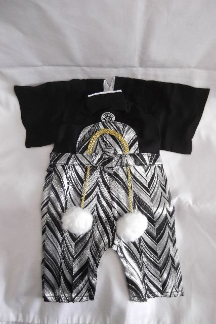 ちりめんの黒紋付きにスカート状の袴を縫いつけた、ワンピース型の紋付き袴です。