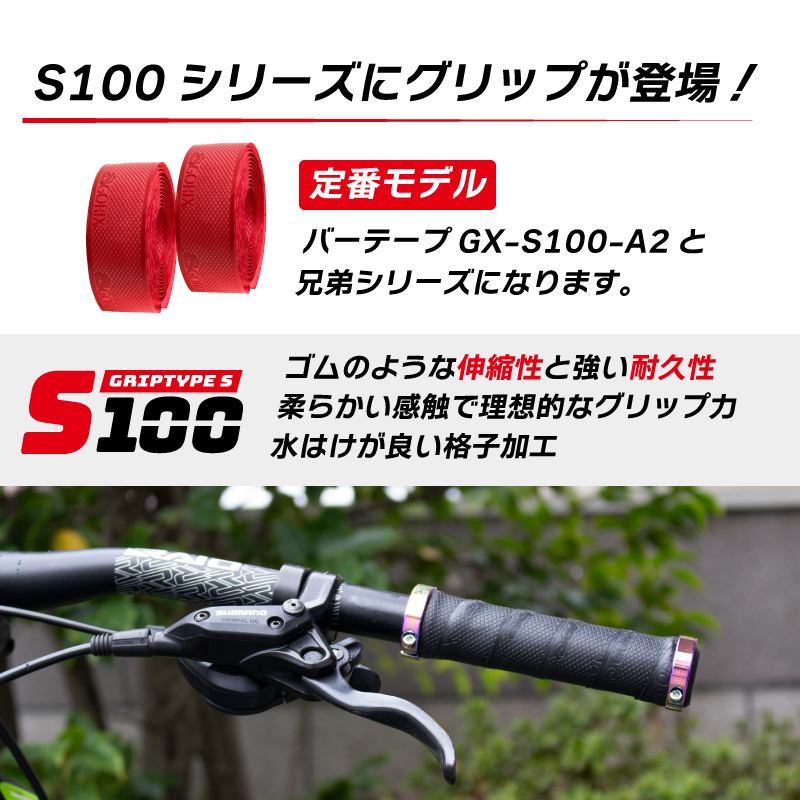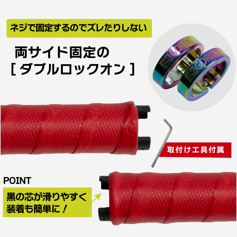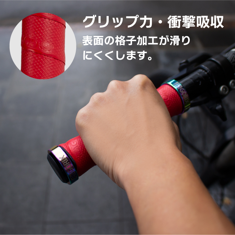 GORIXバーテープの中で古く人気のあるS100から同テープを搭載したグリップが登場! ゴムのような伸縮性と強い耐久性。柔らかい感触で理想的なグリップ力。 水はけが良い格子加工が特徴的です。 両サイドでネジ固定のダブルロックオンタイプで固定力アップ。 リングはおしゃれなオイルスリックで今風に! クロスバイクやミニベロ、小径車などのグリップ交換に最適! [癖のないストレートタイプ] [黒の芯があり滑りやすくて取付・取り外ししやすい] バーテープを外して別なのに付け替えられます。 新しいものに巻き換えることが可能です。 [グリップ力と衝撃吸収] 商品内容自転車グリップ、エンドキャップ、六角工具 グリップ長さ13cm 材質PU(ポリウレタン) 厚さ1.8mm フィットハンドルバーの直径22-22.2mm(ほとんどのタイプの自転車に適しています。) ※一部、特殊なハンドル径のハンドルでは使用できませんので、ご注意下さい。 重量(約)83g(ペア) ・商品は入荷によりキズがある場合があります。 その場合は保証対象外になりますのでご了承お願い致します。 ・ディスプレイ環境により実物と色が異なる場合が有ります。 ・入荷時期により予告無く一部仕様変更する場合が有ります。 | |