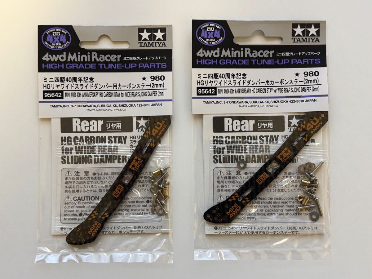 ミニ四駆40周年記念 HG リヤワイドスライドダンパー用カーボンステー(2mm)の2個セットです。