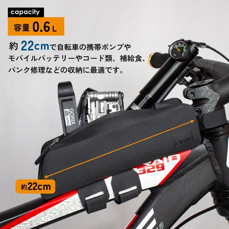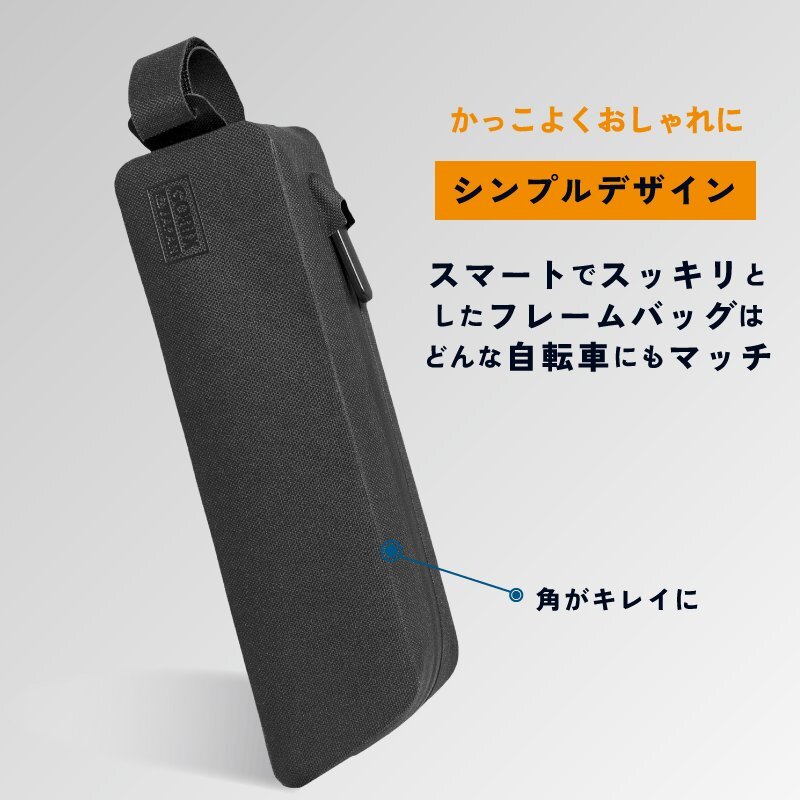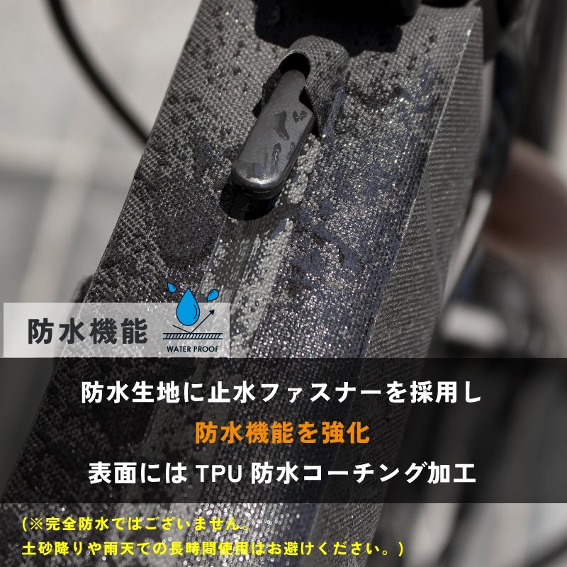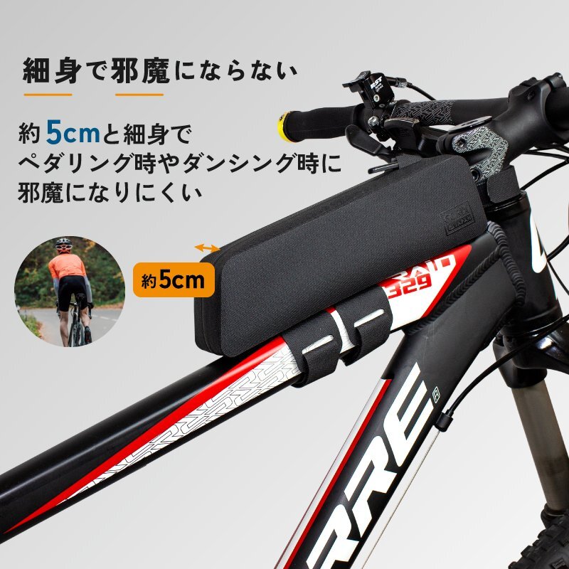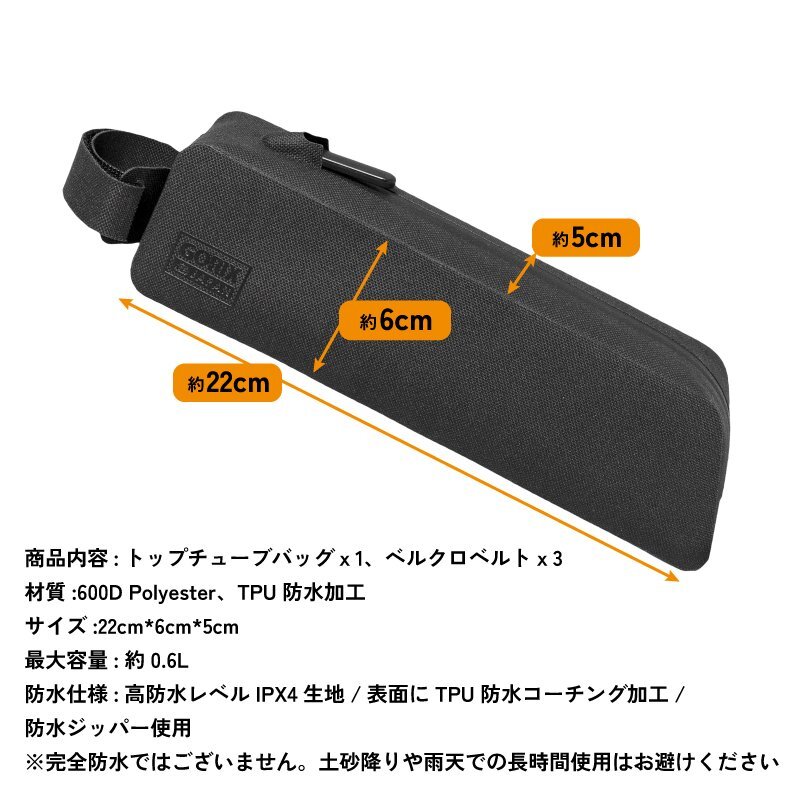 かっこよくシンプルなデザインのトップチューブバッグ。 細身でシンプルデザインPPボード入りで型崩れしないしっかりとした造りになってます。 スマートな見た目でどんな車体にもマッチするでしょう。 細いのでペダリング時も邪魔にならない実用的なトップチューブバッグです。 長さ約22cmあるので携帯ポンプやモバイルバッテリーやコード類、補給食、パンク修理などの収納に。 防水機能もあり突然の雨でも耐えれます。(※ご注意:完全防水ではないため、土砂降りの雨天での使用や長時間水に浸かることは必ずお避けください。) 分厚く丈夫な生地を使用しているため耐久性があり破れにくい。また汚れにくいのも特徴です。 ベルクロで装着するタイプなので様々な自転車に装着する事が可能。 ロードバイクやクロスバク、ミニベロ、折りたたみ自転車、mtbなどの自転車に。 [シンプルデザイン] スマートでスッキリとしたフレームバッグはどんな自転車にもマッチ。 かっこよくおしゃれに。 [細身で邪魔にならない] 約5cmと細身なサイズでペダリング時やダンシング時に邪魔になりにくい。 [容量0.6 L] 長さ約22cmで自転車の携帯ポンプやモバイルバッテリーやコード類、補給食、パンク修理などの収納に最適です。 中の生地は少しクッション性がありしっかりと保護します。 [防水機能] 防水生地に止水ファスナーを採用し防水機能を強化。 表面にTPU防水コーチング加工 防水ジッパー使用で隙間からの水の侵入を防止します。 (※完全防水ではございません。土砂降りや雨天での長時間使用はお避けください。) [タフな生地を採用] 分厚く丈夫600D生地を採用し破れにくく汚れにくい。 また汚れを落としやすい材質で掃除しやすくキレイを長い期間保ちします。 [型崩れしない] PPボードが入っているためトップチューブはしっかりと自立してよれない。 荷物が少なくても多くてもしっかりとキレイな形を維持します。 商品内容トップチューブバッグx1、ベルクロベルトx3 材質600D Polyester、TPU防水加工 サイズ22cm*6cm*5cm 最大容量約0.6L 防水仕様高防水レベルIPX4生地/表面にTPU防水コーチング加工/防水ジッパー使用 カラーブラック | |